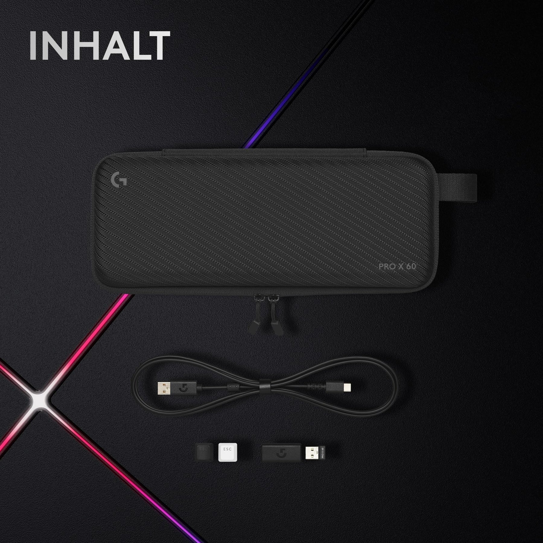 • Inhalt: PRO X 60 kabellose Gaming-Tastatur, kabelloser LIGHTSPEED USB-Adapter, Lade- und Datenkabel USB-A auf USB-C (1,8 m), Logitech G Tastenkappen, Reise-Etui, Bedienungsanleitung