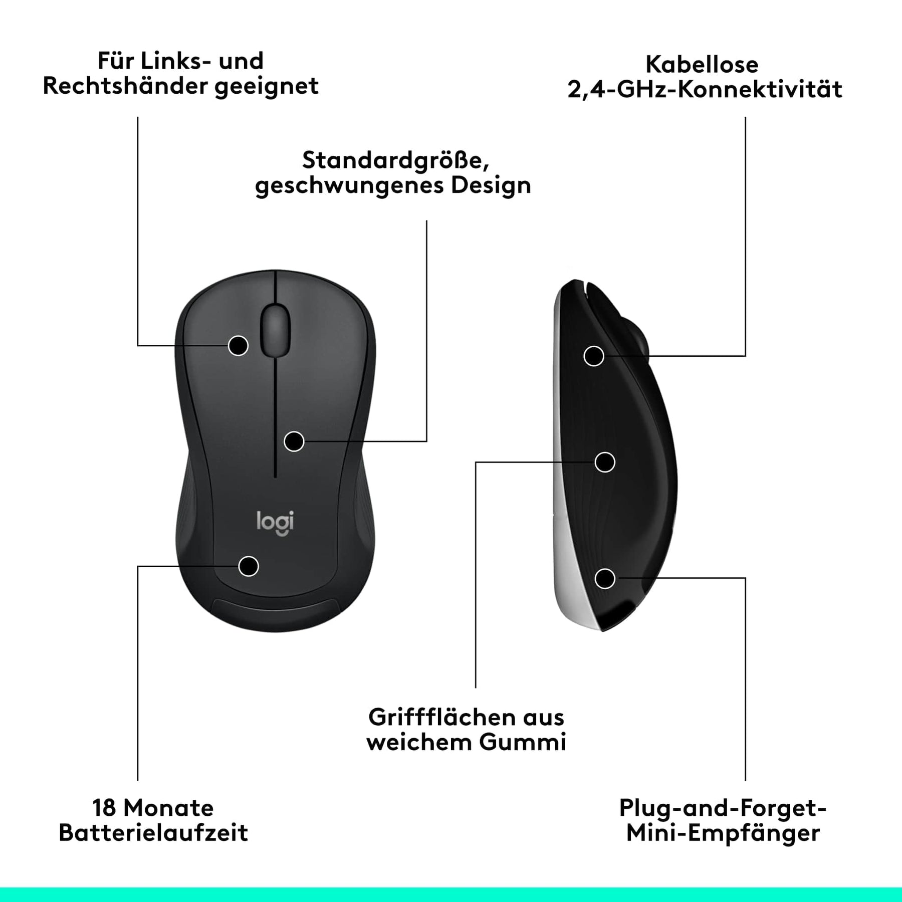 Logitech MK540 Advanced Kabellose Tastatur und Maus Logitech MK540 Advanced ist eine kabellose Tastatur-Maus-Kombination, die für Präzision, Komfort und Zuverlässigkeit entwickelt wurde. Der winzige USB-Empfänger ist mit der Logitech Unifying Technologie ausgestattet. Die Tastatur ist spritzwassergeschützt (1) und der verschleißfeste Tastendruck sorgt dafür, dass die Tasten nicht so schnell verblassen. Die Handballenauflage und die verstellbaren, ausklappbaren Füße ermöglichen selbst an längeren Tagen am Schreibtisch bequemes Arbeiten. Die Tastatur bietet praktische Sondertasten für direkten Zugriff sowie voreingestellte Funktionstasten, welche in Logitech Options personalisiert werden können. Die Maus passt sowohl in die rechte als auch in die linke Hand und bietet eine fortschrittliche Tracking-Technologie sowie eine präzise Cursor-Steuerung. Tastatur Produktdetails: Abmessungen: 193,5 x 457,3 x 24 mm Gewicht: 805 g Einstellbare Tastaturhöhe: 3 Neigungspositionen Sondertasten: Musiksteuerung, programmierbare Tasten 10-Tasten-Zahlenblock Handballenauflage Tasten-Typ: Tiefes Profil Feststelltasten-Kontrollleuchte Ein-/Ausschalter 2 AAA-Batterien(Alkaline Batterie) Batterielebensdauer: 36 Monate Maus Produktdetails: Abmessungen: 61,8 x 39,2 x 11,5 mm Gewicht: 73,5 g Sensor-Technologie: Advanced Optical Tracking Anzahl der Tasten: 3 (Links-/Rechts-Klick, Mittelklick) Scrollen: Zeilenweise Scrollrad: 2D, optisch Verbinden/Stromversorgung: Ein/Aus-Schalter 1 AA-Batterie(Alkaline Batterie) Batterielebensdauer: 18 Monate Kabellose Reichweite: Bis zu 10 m (2) Kompatibel mit Windows 7, 8, 10 oder höher, Chrome OS (1) Unter eingeschränkten Bedingungen getestet (maximal 60 ml Flüssigkeit). Die Tastatur nicht in Flüssigkeit tauchen. (2) Die kabellose Reichweite ist abhängig von Nutzungs-, Umgebungs- und Computerbedingungen. (3) Die Batterielaufzeit der Tastatur und Maus ist von Nutzungs- und Umgebungsbedingungen abhängig.