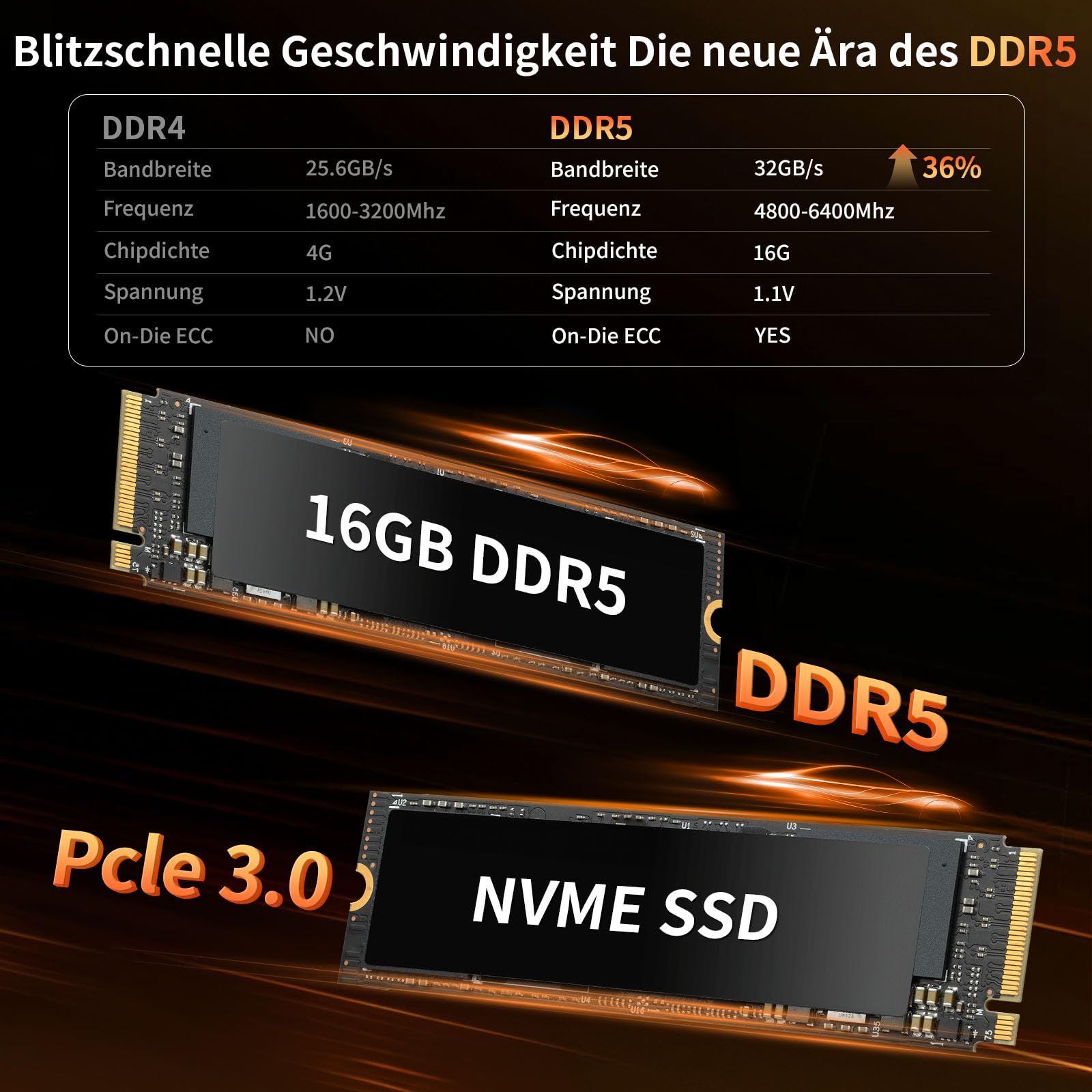 - 【Celeron N95+16GB DDR5】Der Celeron N95 Prozessor verfügt über vier Kerne und vier Threads, mit einer Basisfrequenz von 1,7 GHz und einem Turbo-Boost von bis zu 3,4 GHz, der alltägliche Aufgaben mühelos bewältigt. In Kombination mit 16 GB DDR5 RAM bietet er höhere Bandbreite und schnellere Datenübertragungsraten, was die Leistung erheblich steigert und die Ladezeiten verkürzt.