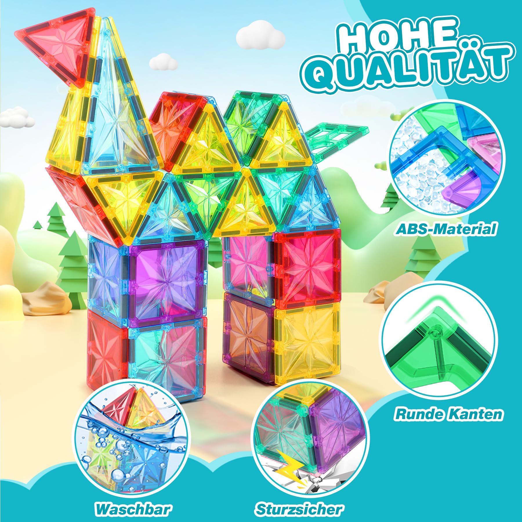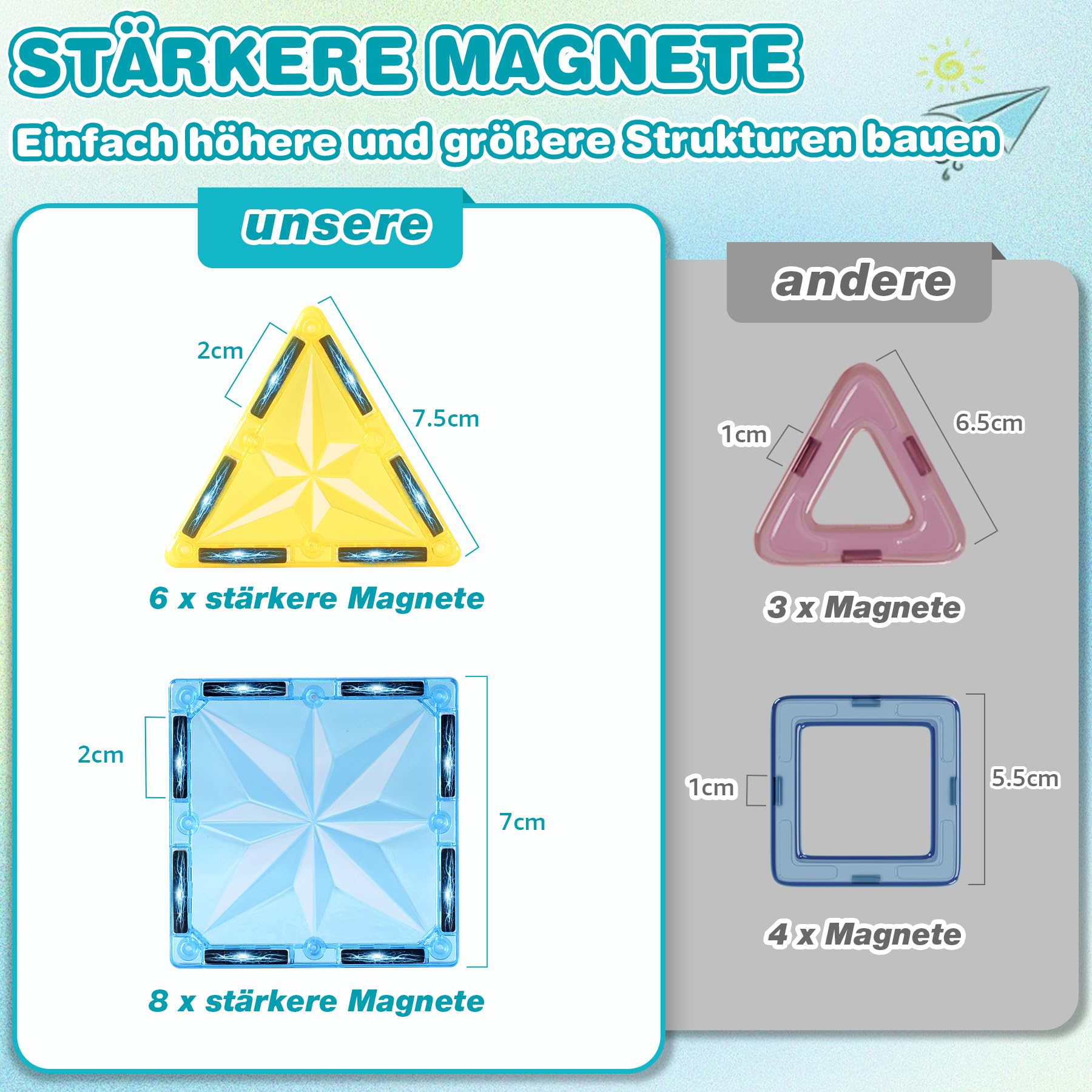 - [Starker Magnetismus] - Im Gegensatz zu anderen, die nur 1 kurzen Magneten auf jeder Seite haben, haben unsere magnetische bausteine 2 lange, starke Magneten, um sicherzustellen, dass die Blöcke sicher verbunden sind, so dass Kinder große Strukturen mit vielen Blöcken bauen können, ohne sich Sorgen über den Zusammenbruch zu machen. Diese magnetische Funktion verbessert nicht nur das Bauerlebnis, sondern lehrt die Kinder auch auf spielerische Weise die Prinzipien des Magnetismus