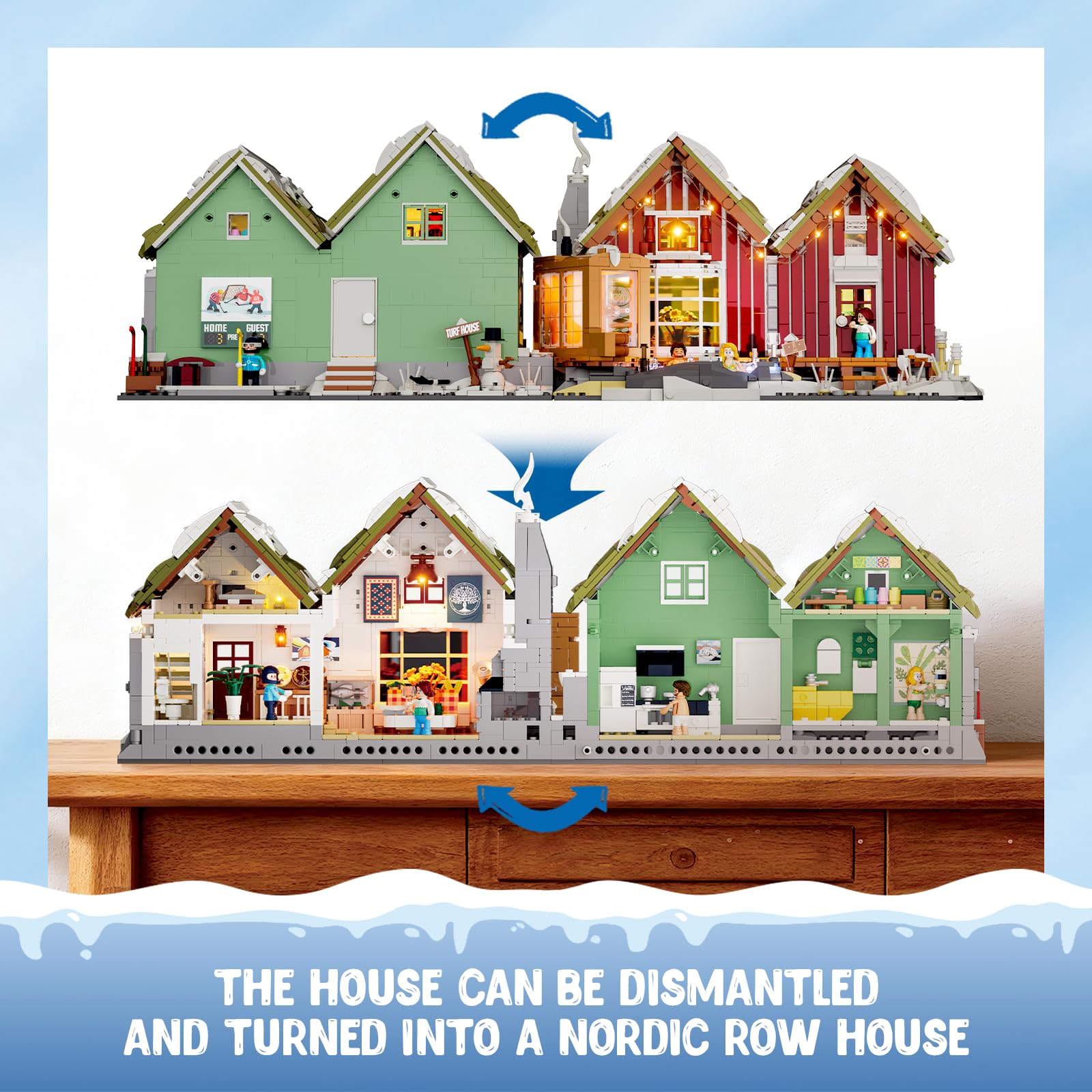- 【Teilbares Reihenhaus|Doppelszenen-Anzeige】 Vorder- und Rückseite farbcodiert, teilbar für nebeneinander Aufstellung. Vorderseite: SPA-Hot Spring-Bereich; Rückseite: Eishockey-Szene mit Minifiguren. 360°-Design erhöht Interaktivität und Platzierungsflexibilität; geeignet für Zuhause, Ausstellungen oder Kombination mit anderen nordischen Sets.