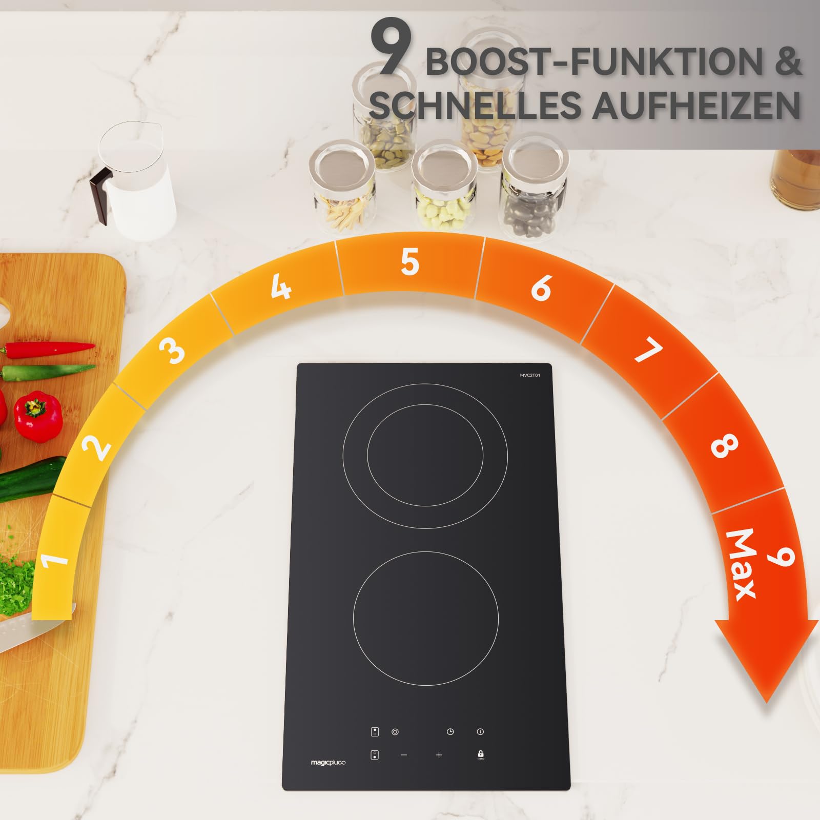 - 【Mehrere Heizstufen】 Passen Sie die benötigte Heizung frei an. Schalten Sie schnell die Heizstufe Max 9 ein. Das magicplux Cerankochfeld verdient Ihre Küche