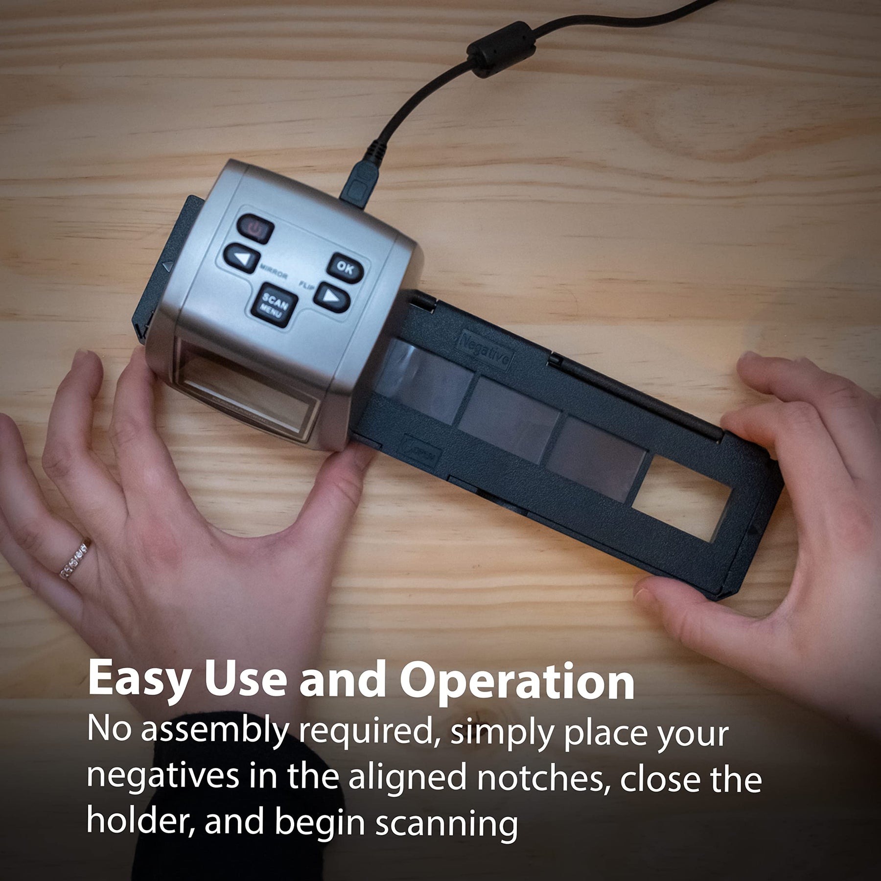 • Einfach zu bedienen – keine Montage erforderlich, legen Sie einfach Ihre Folie in die ausgerichteten Kerben, schließen Sie die Halterungskanten, um Ihre Negative an Ort und Stelle zu halten und beginnen Sie mit dem Scannen