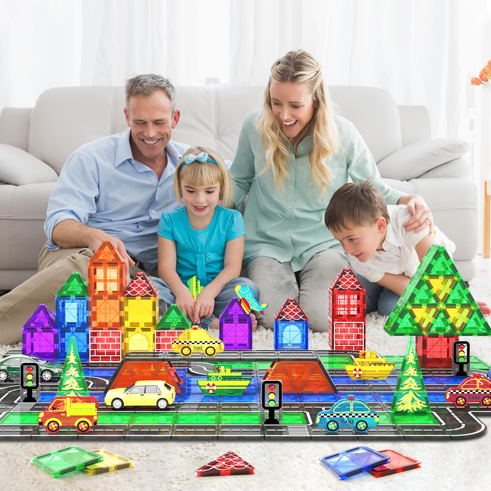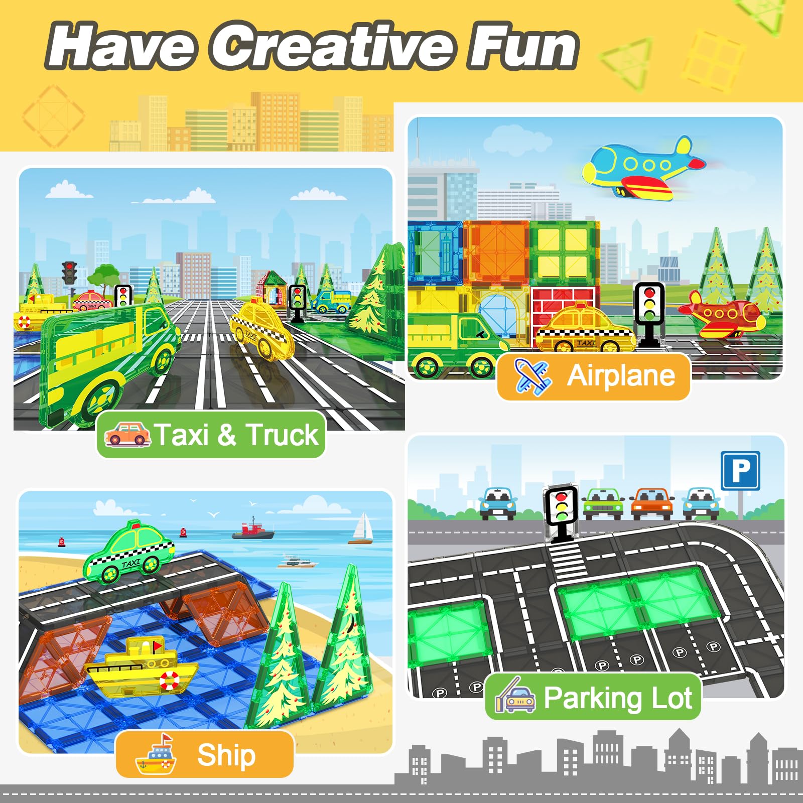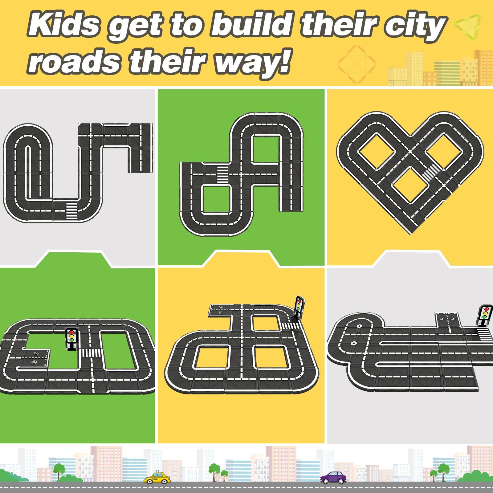 - Magnetische Fliesen im Stadtverkehr: Magnetische Straßen – Lassen Sie das Lieblingsauto Ihrer Kinder frei laufen! Im Gegensatz zu traditionellen einfarbigen Fliesen bietet dieses Set verschiedene Stadtstraßen. Von Kreisverkehren bis hin zu Gehwegen, einschließlich Taxis, Lastwagen, Booten und Flugzeugen, lassen Sie Kinder verschiedene Verkehrsszenarien simulieren, um Fantasie anzuregen und gleichzeitig Spaß zu haben