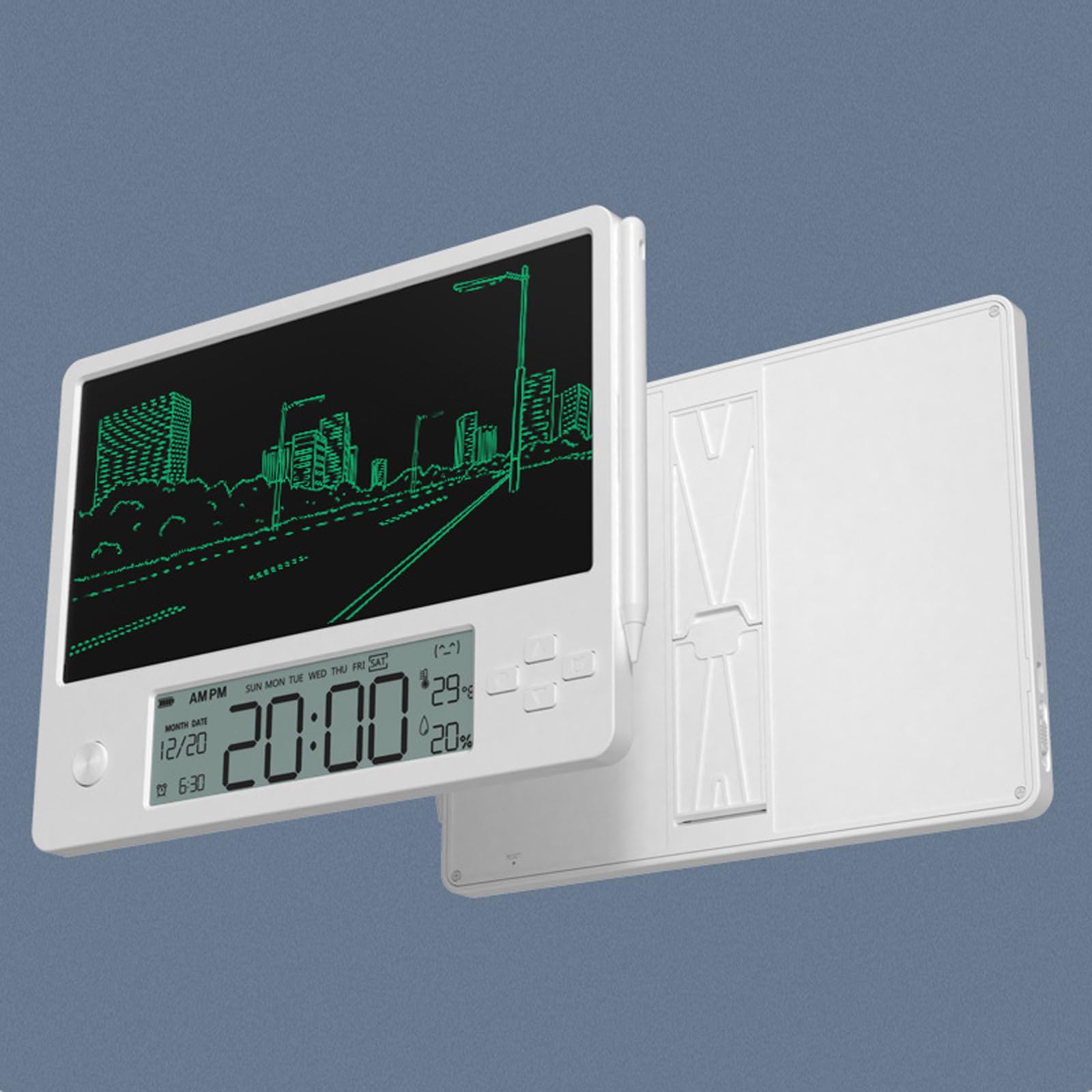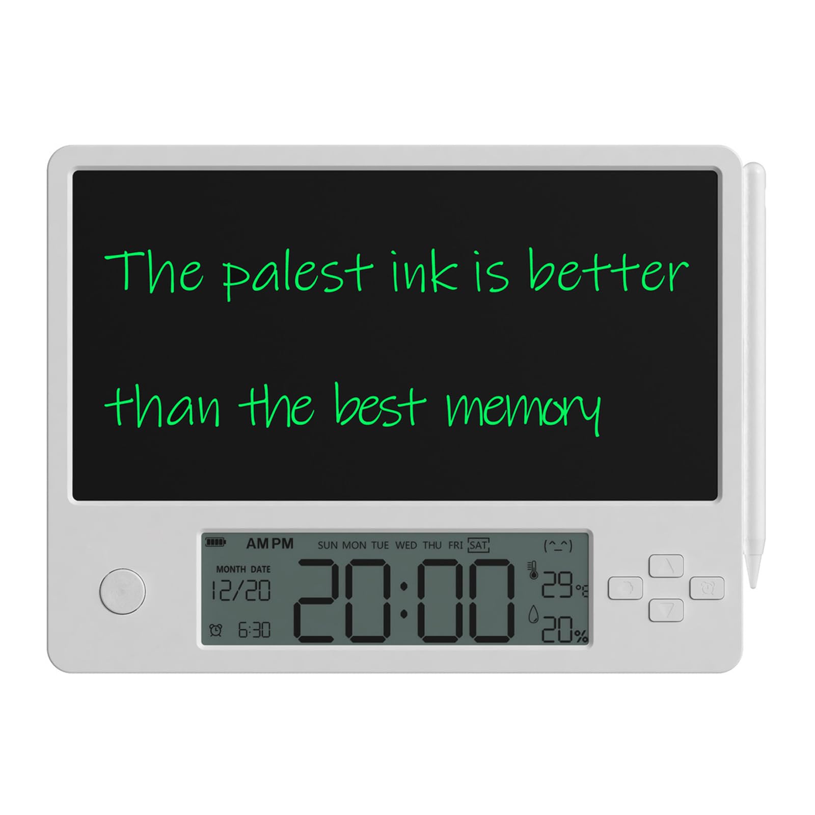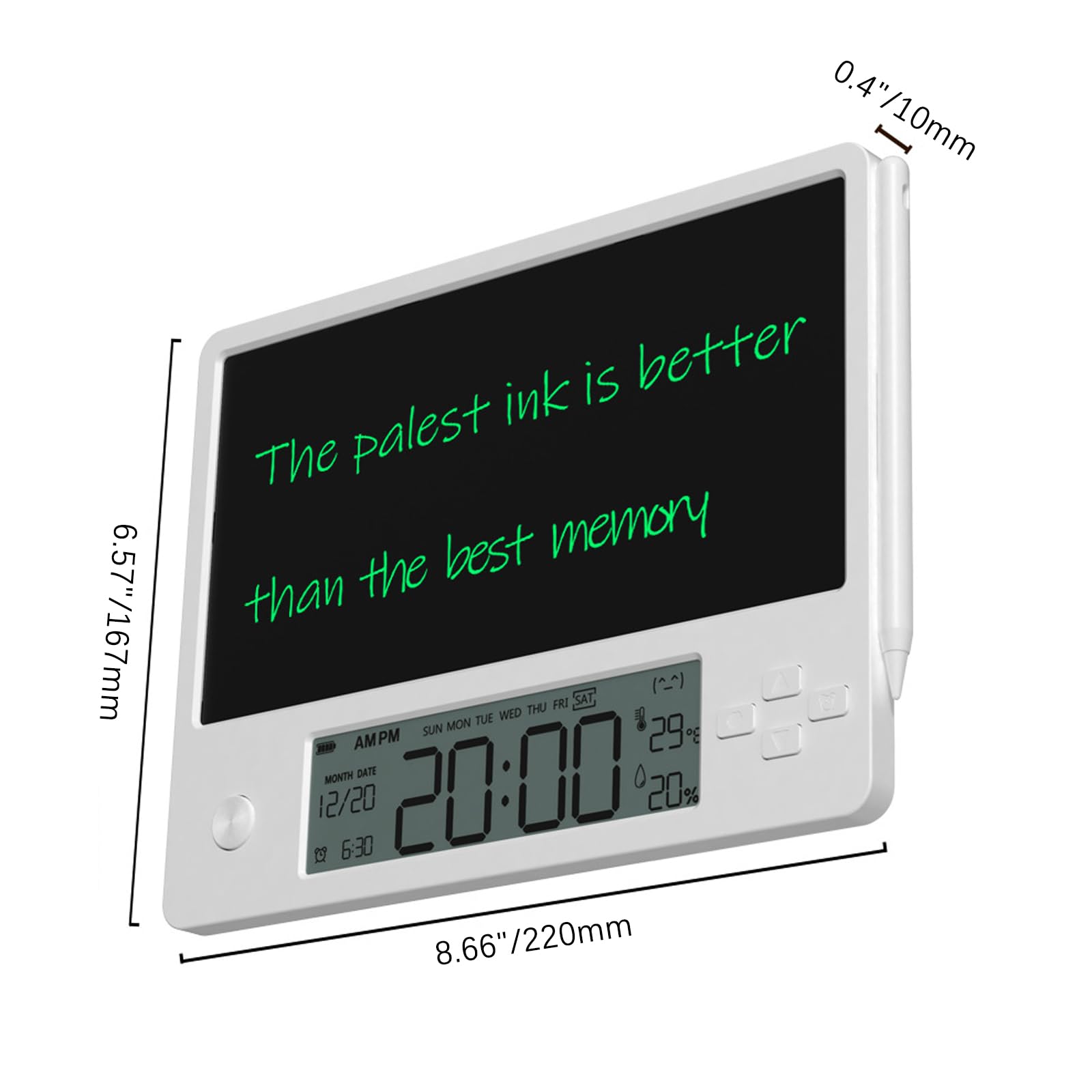 Einzelheiten: Spezifikation: Farbe: Weiß. Produktgröße: 220 x 167 x 10 mm. Produktgewicht: 208 g. Akku-Kapazität: 200 mAh Das elektronische Kalenderschreibtablett mag gewöhnlich erscheinen, hat aber eine Vielzahl von Funktionen. Notieren Sie im täglichen Leben die wichtigen Ereignisse des Tages und stellen Sie einen Wecker ein, um Sie rechtzeitig zu erinnern. Lernen, Entwurfssimulation, Formel stilles Schreiben und andere Lernszenarien. Bei der Arbeit sind Arbeitspläne, Arbeitsnotizen, Gruppendiskussionstafeln und andere Arbeitsszenarien mit einer Klick-Clearing-Funktion ausgestattet, um Ihre Arbeitseffizienz erheblich zu verbessern. Der Doppelkartensteckplatzständer wird mit Ihnen platziert, und der Tischständer ist nicht nur schön, sondern auch praktisch. Uhrzeit, Datum, Tag des Tages, Temperatur, Luftfeuchtigkeit und Wecker auf dem LCD-Bildschirm sind auf einen Blick klar. Der magnetische Schreibstift ist nicht leicht zu verlieren, die Handschrift ist klar, und er simuliert echtes menschliches Schreiben. Elektronische Kalenderschreibtabletten sind normalerweise leicht und einfach zu tragen. Sie können es jederzeit und überall verwenden, ohne sich auf andere Werkzeuge wie Stift und Papier verlassen zu müssen. Lieferumfang: 1 x elektronisches Kalender-Schreibtablett.