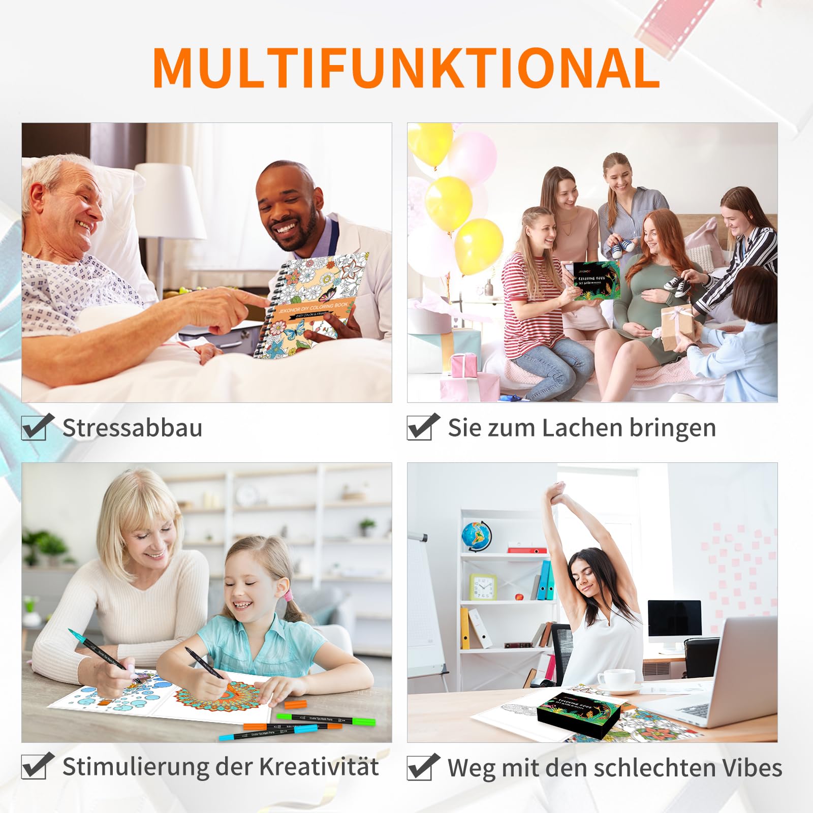 - ☘️Thoughtful Geschenk für alle Anlässe: Dieses Set ist ein perfektes Geschenk für Geburtstage, Feiertage oder als aufmerksame Geste für Menschen, die sich in der Reha befinden, sich von einer Krankheit erholen oder einfach nur ein gutes Lachen brauchen. Unser Malbuch für Erwachsene mit Markern ist eine lustige und sinnvolle Art, Freunde und Familie zu entspannen und ihnen den Tag zu verschönern!