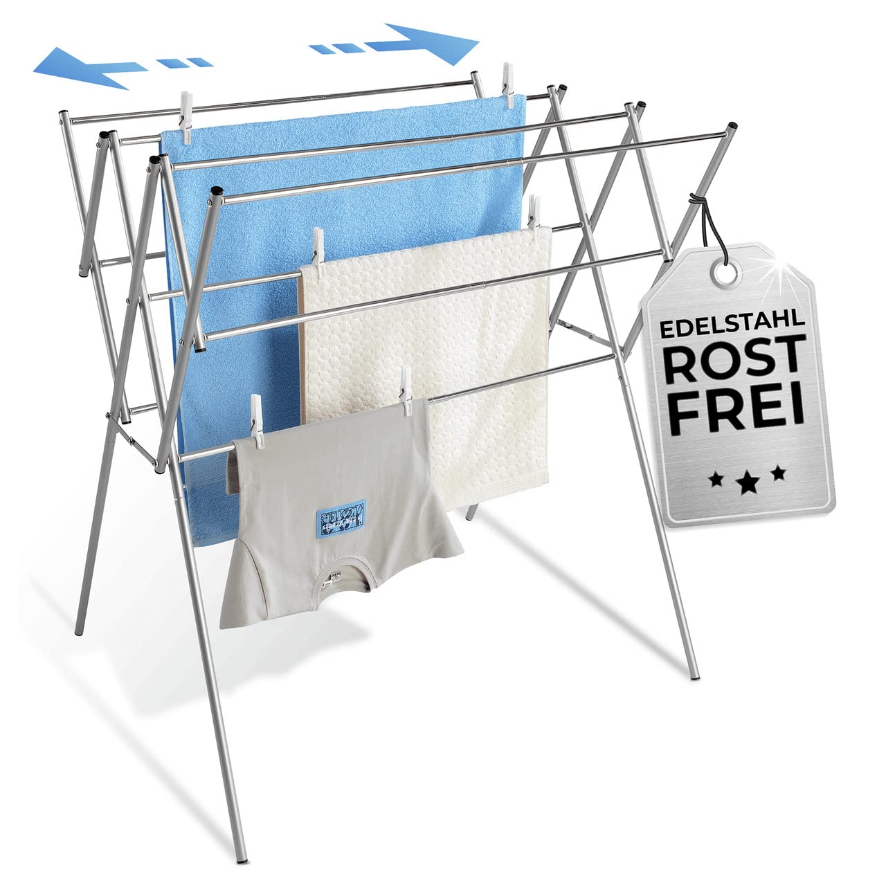 Einzelheiten: Der Teleskop-Wäschetrockner passt sich unterschiedlichen, räumlichen Gegebenheiten flexibel an. Die Gesamttrockenlänge beträgt 7,78 m. Er ist auch ideal als Handtuchständer im Badezimmer geeignet. Die standfeste Ausführung aus hochwertigem, rostfreiem Edelstahl ist je nach Wunsch von 54 bis 92 cm auseinanderziehbar. Er ist ebenso raumsparend auf nur 7 cm Tiefe zusammenklappbar und findet Platz in jeder Nische. Die HerstellerGewähr beträgt 5 Jahre.