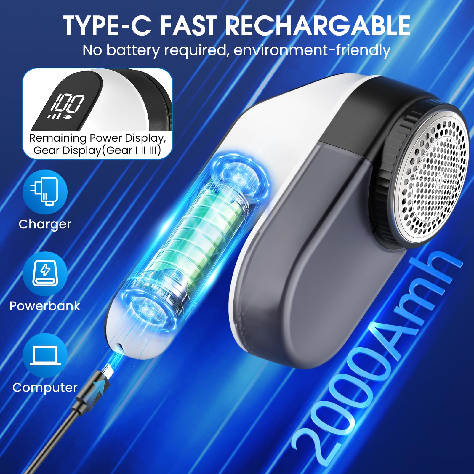 - 【Große Kapazität des Elektrischer Fusselentferner】Hochwertige Fusselrasierer ist mit einem 2000 mAh Li-Ion-Akku ausgestattet und unterstützt schnelles Aufladen über den Type-C-Anschluss. Nach vollständiger Aufladung arbeitet er bis zu 3 Stunden. Stoffrasierer verfügt über einen abnehmbare, große Fusselbehälter muss nicht häufig entleert werden. Zusätzlich wird eine Reinigungsbürste zum Entfernen von Fusseln an Klingen und Gitter mitgeliefert