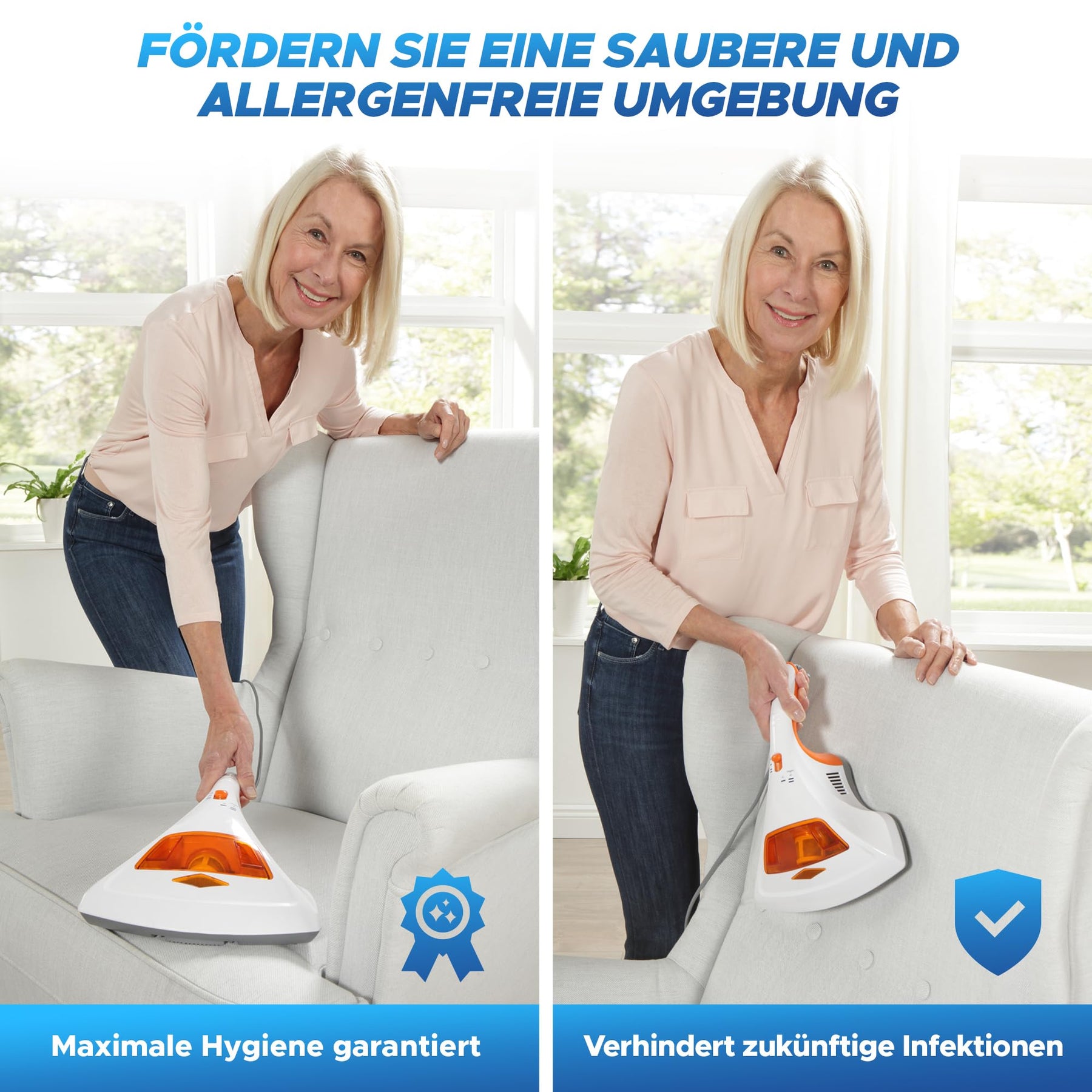 • HYGIENISCHE SAUBERKEIT. In 3 Stufen reinigt der Milbensauger hygienisch rein: 1. Auflockern der Milben und des Milbenkots. 2. Abtöten der Milben und Keime. 3. Absaugen von Milben und feinsten Schmutzpartikeln.