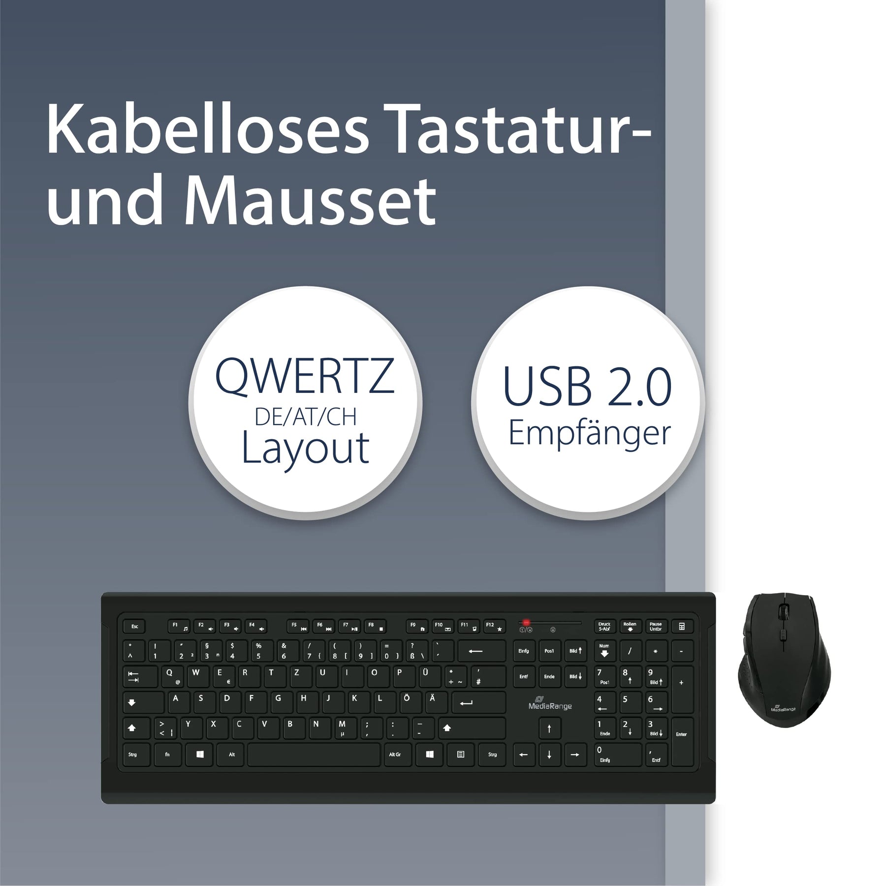 MediaRange Eingabegeräte eignen sich ideal für sämtliche Anwendungen im Büro oder Zuhause. Unser Set, bestehend aus kabelloser Tastatur und Maus, lässt sich schnell und einfach per USB Empfänger verbinden und ist dank Plug & Play mit sämtlichen gängigen Betriebssystemen kompatibel und sofort einsatzbereit. Mit über 10 Millionen Tastenanschlägen und Spritzwasserschutz, sind unsere Tastaturen ideal vor äußeren Einwirkungen des Alltags geschützt. Die praktische Höhenverstellung sorgt zusätzlich für mehr Schreibkomfort.