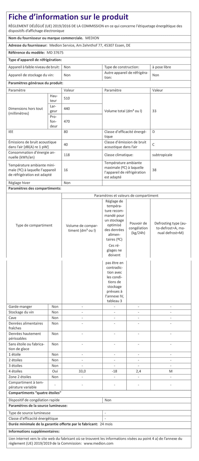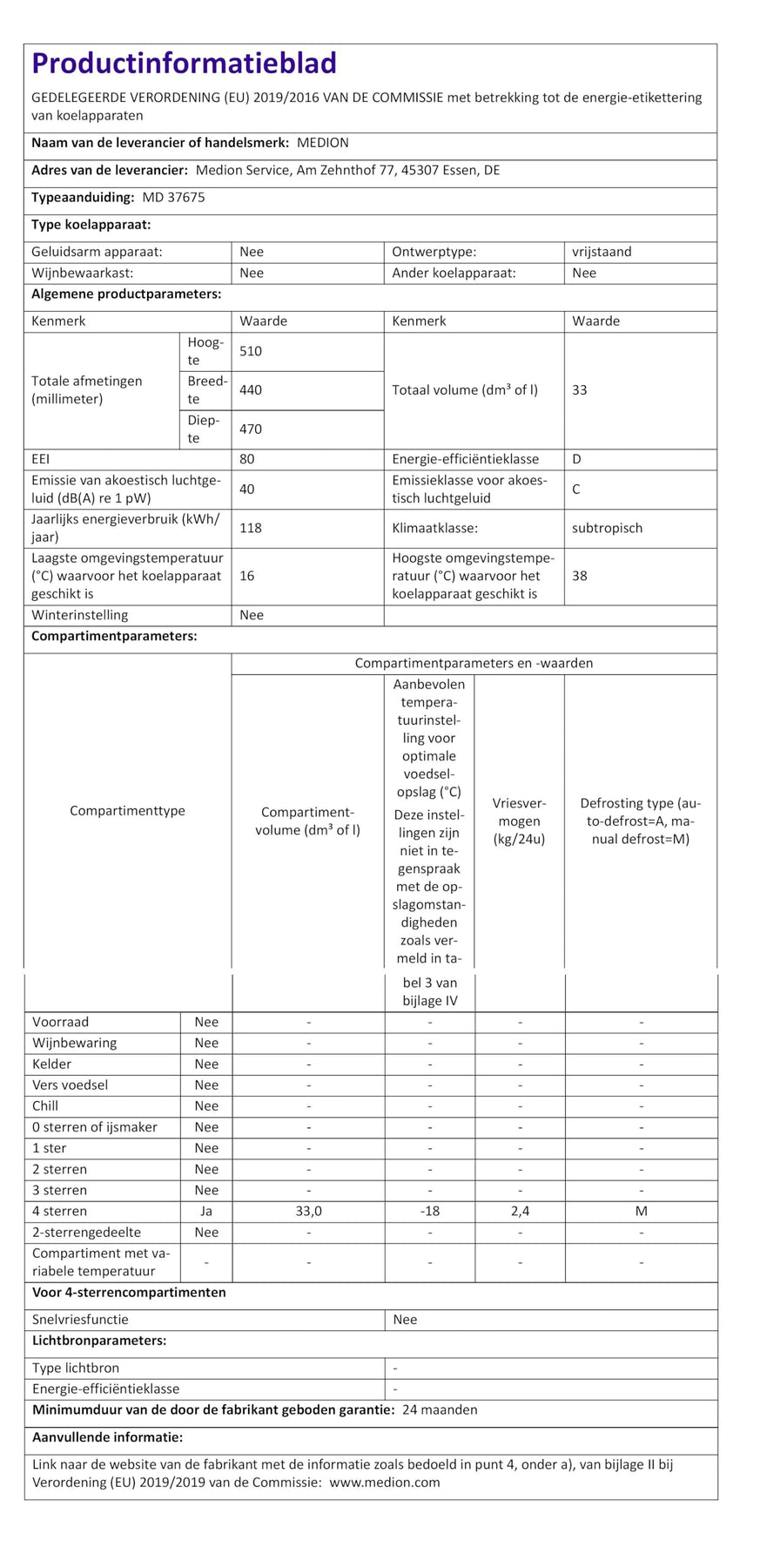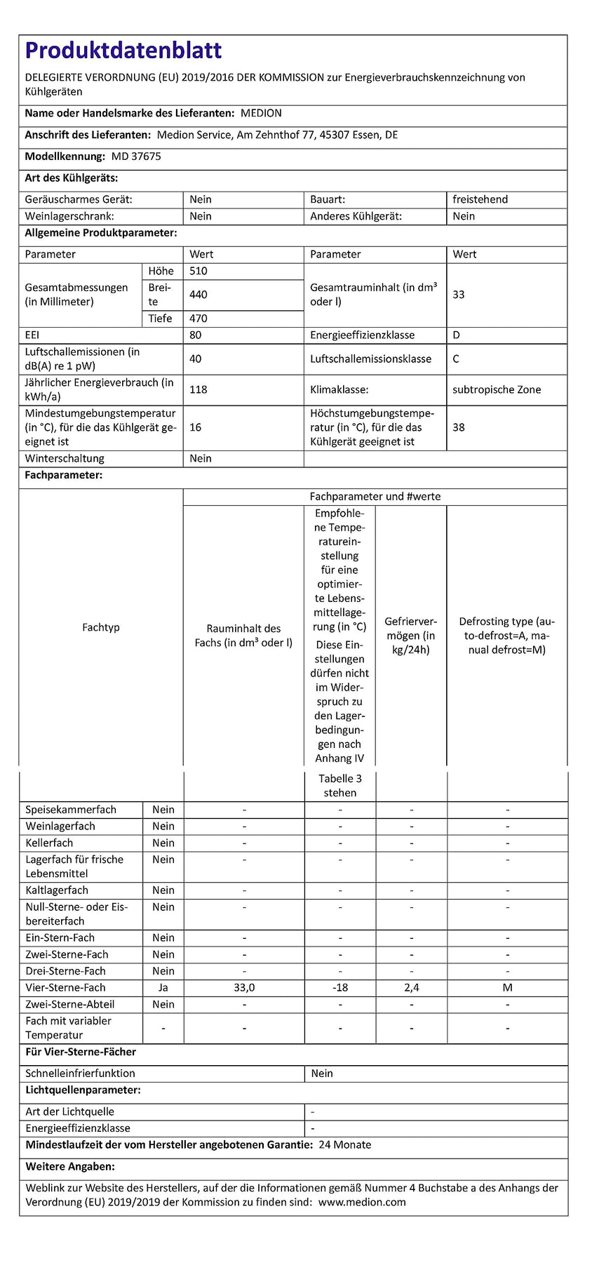 • Lieferumfang: Mini-Gefrierschrank MD 37675, Bedienungsanleitung und Garantieinformationen