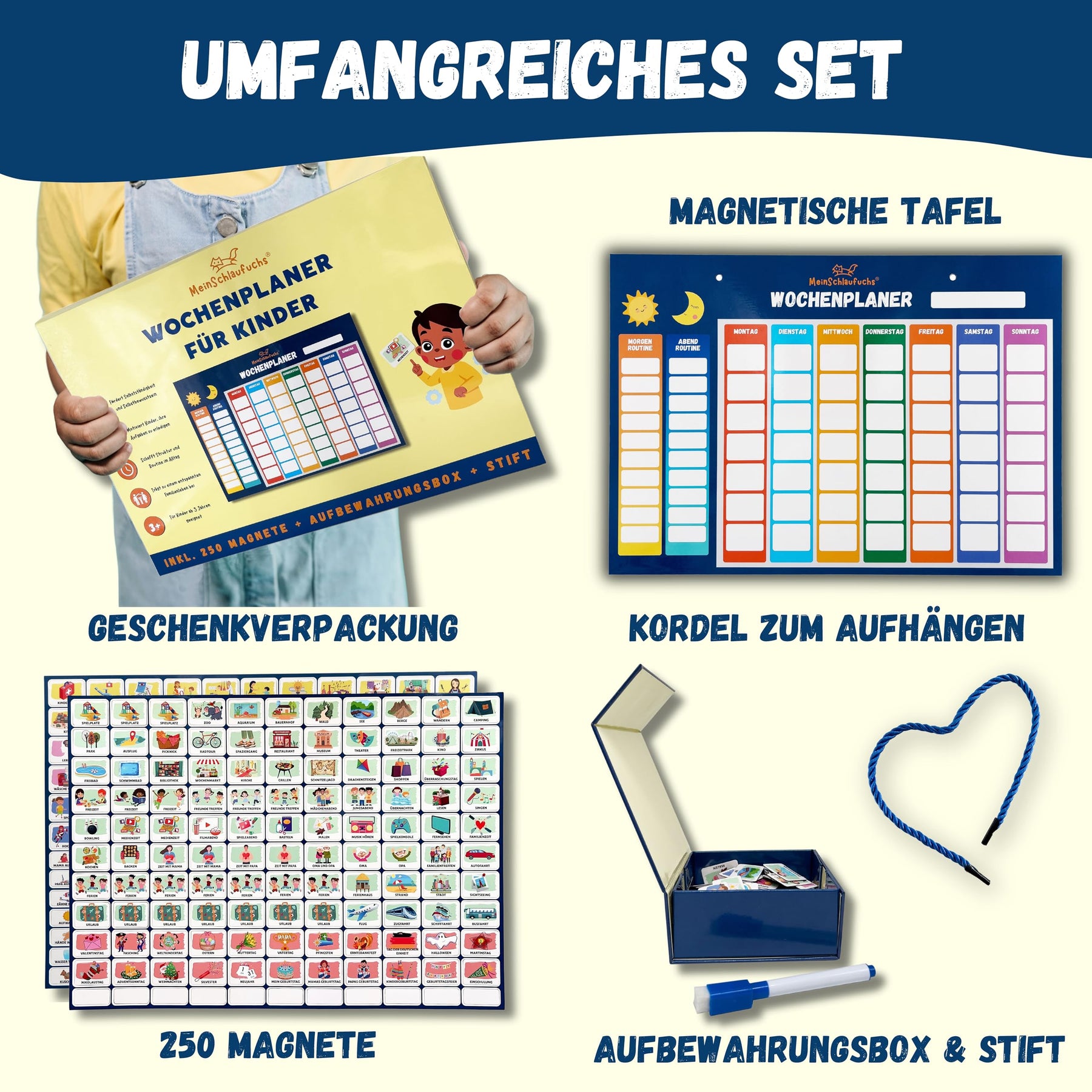 MeinSchlaufuchs® Wochenplaner Kinder - Montessori Magnettafel inkl. 250 Magnete, Aufbewahrungsbox, Kordel & Stift - beschreib- & abwischbar - Routine Planer Kinder - Kalender Kinder