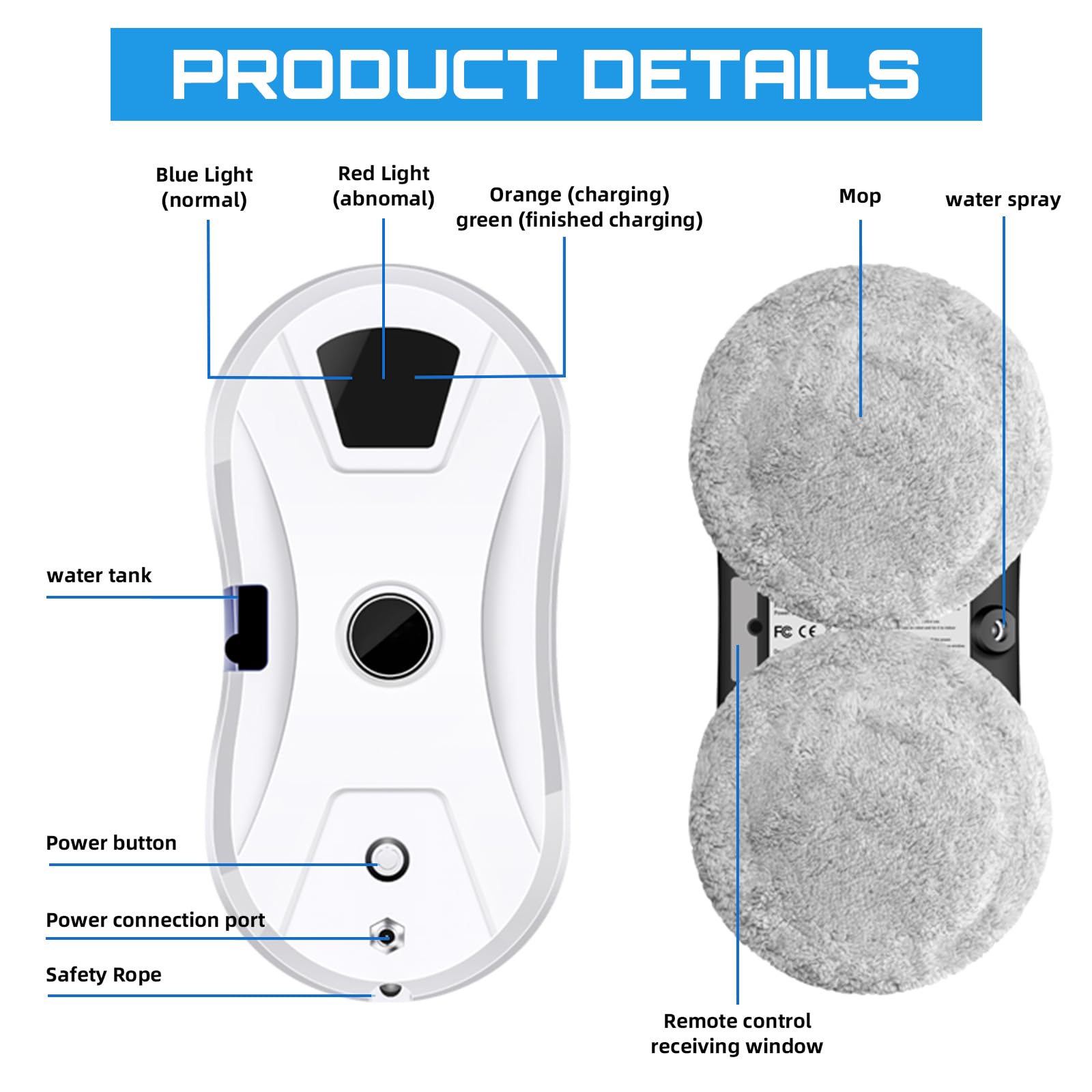 - 🌟【Intelligente fensterreiniger roboter】 Ein-Klick-Aktivierung des fenster roboter, intelligente und automatische Planung des Z-förmigen Reinigungswegs, um die Reinigungseffizienz zu verbessern und verpasste Bereiche zu vermeiden. Die Fernbedienung kann die Fensterreinigungsrichtung nach oben, unten, links, rechts einstellen und je nach Bedarf reinigen. Der hochpräzise Sensor erkennt Kanten und passt den Reinigungsweg an, sodass er sowohl für gerahmtes als auch für rahmenloses Glas geeignet ist.