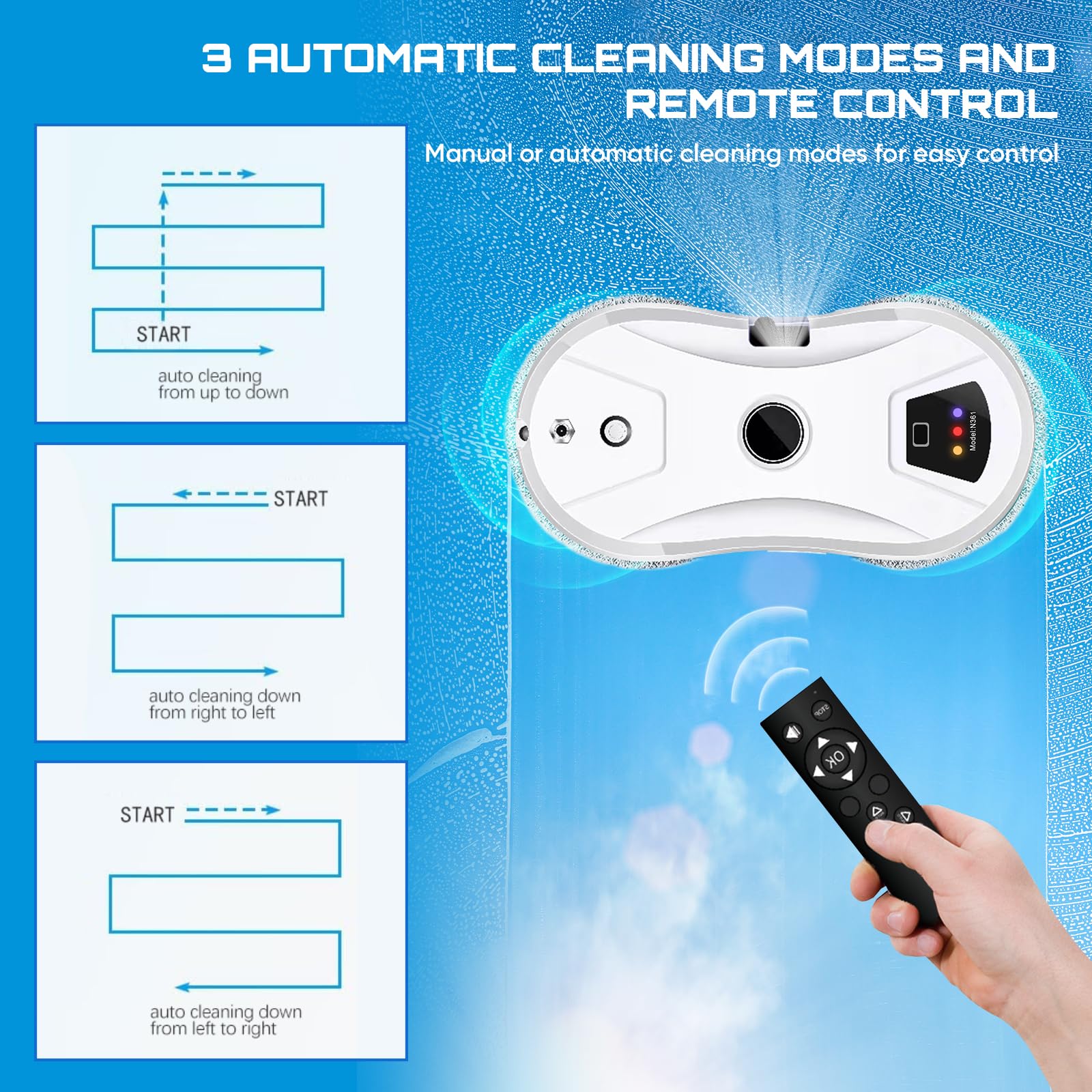 Der Glasreinigungsroboter verfügt über drei automatische Reinigungsmodi, um unterschiedlichen Reinigungsanforderungen gerecht zu werden. Simuliert die Hand zum Fensterputzen und hilft so, das Problem der Hausarbeit zu lösen. Mit der mitgelieferten Fernbedienung können Sie den Fensterputzroboter innen und außen ganz einfach bedienen und steuern, was für noch mehr Komfort sorgt. Der Doppelspiral-Reinigungskopf mit Mikrofaser-Reinigungstüchern sorgt dafür, dass der Fensterwaschroboter das Fenster reinigt, ohne die Oberfläche zu zerkratzen und streifenfrei zu reinigen.