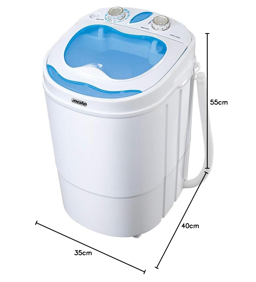 Einzelheiten: Mesko Mini-Waschautomat MS 8053. It is not always possible to have access to a standard washing machine or a laundry when you need to wash your clothes: such a case might appear during a longer trip, going camping or even at home, when your standard washing machine gets broken. Sometimes it also happens that you need to laundry few things fast and it is unecological, unsafe and uneconomical to start the washing machine. In all those cases AD8051 mini washing machine can be a solution. It is small and light, therefore easy to be transported. Since it does not occupy much space, it can be placed even in a camping van or in a small flat. This lightweight and compact washing machine has a capacity of 3kg. It is perfect for washing small amounts of laundry ? even delicate fabrics. Its washing programme is short, it lasts only 15 minutes. The device has low water and energy consumption and is easy to use. It also has a spinning program to use after the garments are washed.