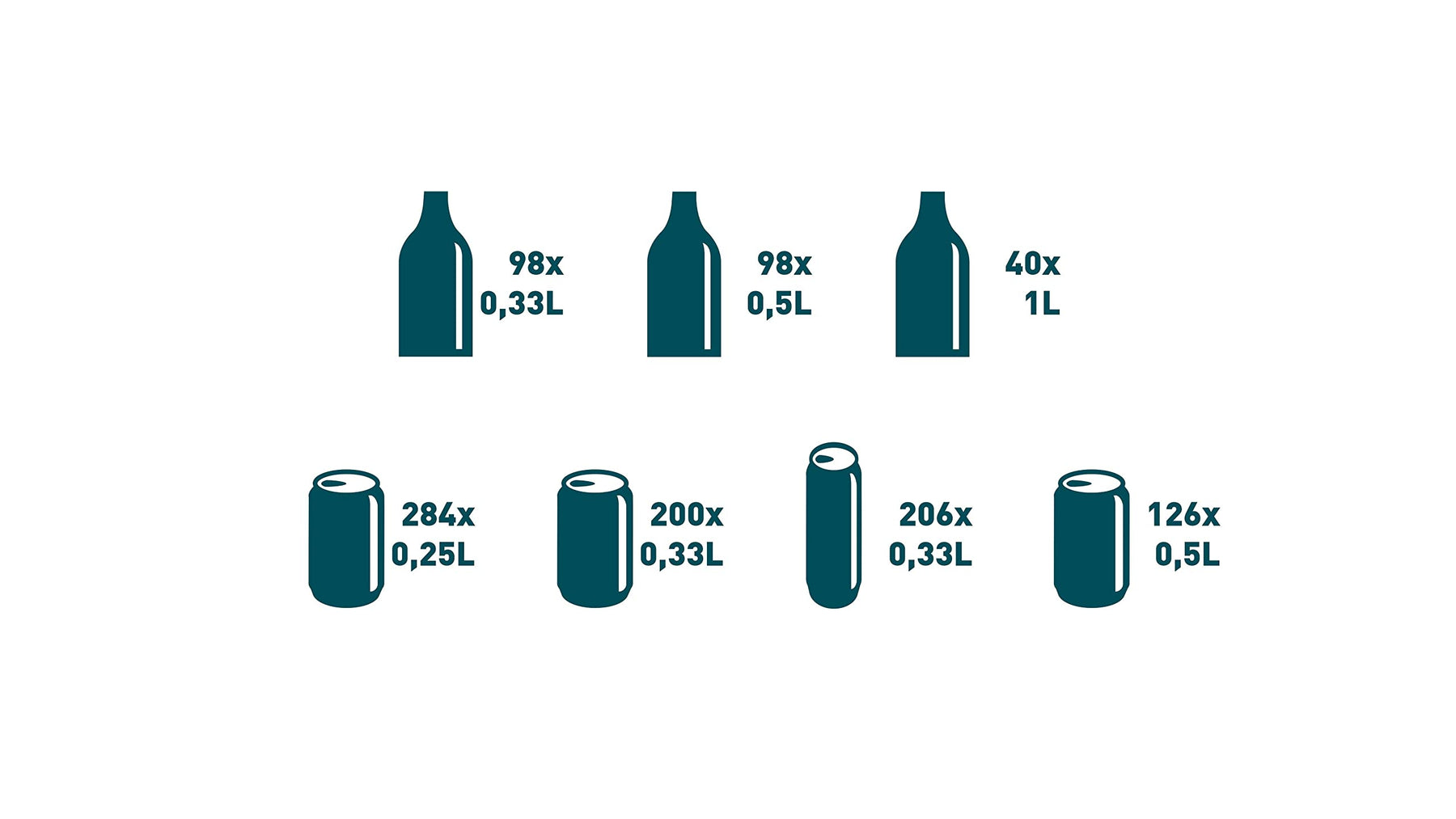 • Der Kühlschrank bietet mit seinen 6 verstellbaren Einlegeböden ausreichend Stauraum für Getränke. Abmessungen: B 469 x L 345 mm (5 Böden) + B 470,5 x L 185 mm (1 Boden), Maximale Traglast: 25 kg pro Fachboden