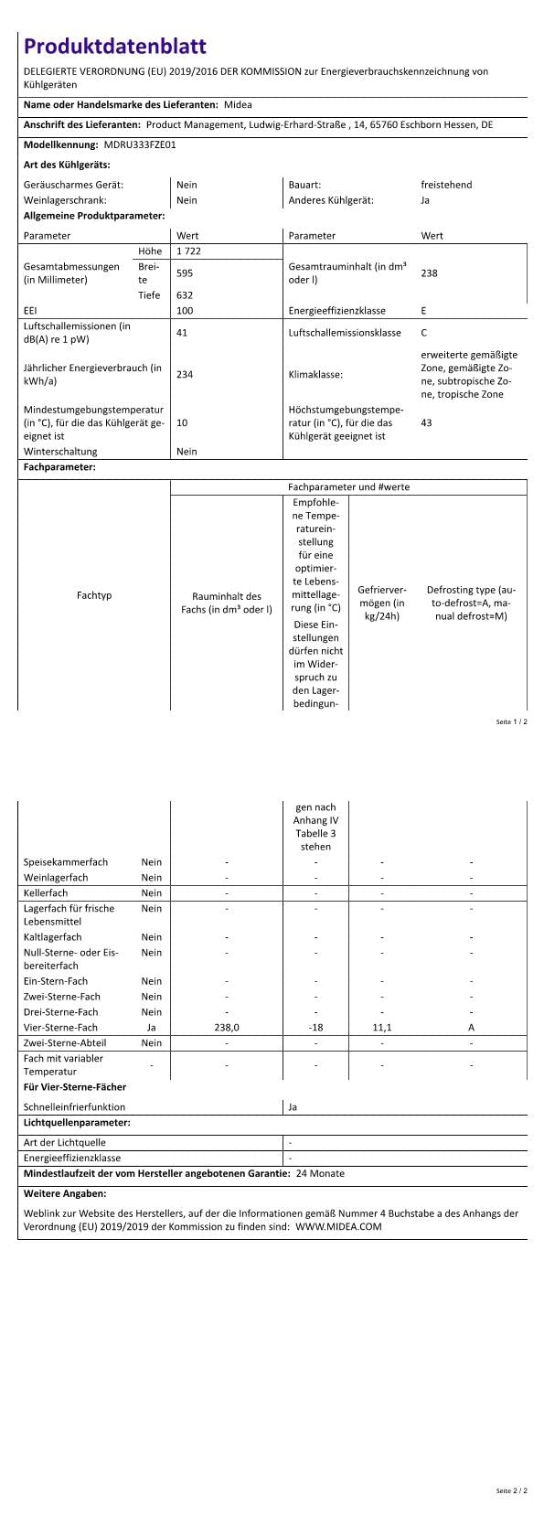 Einzelheiten: Midea MDRU333FZE01 Gefrierschrank/Kühlschrank/NoFrost/238L/172,2 cm hoch/Flexible Kühl- und Gefrierfunktion/Umwandlungsmodus/Easy Open Handgriff/Wechselbarer Türanschlag/Weiß