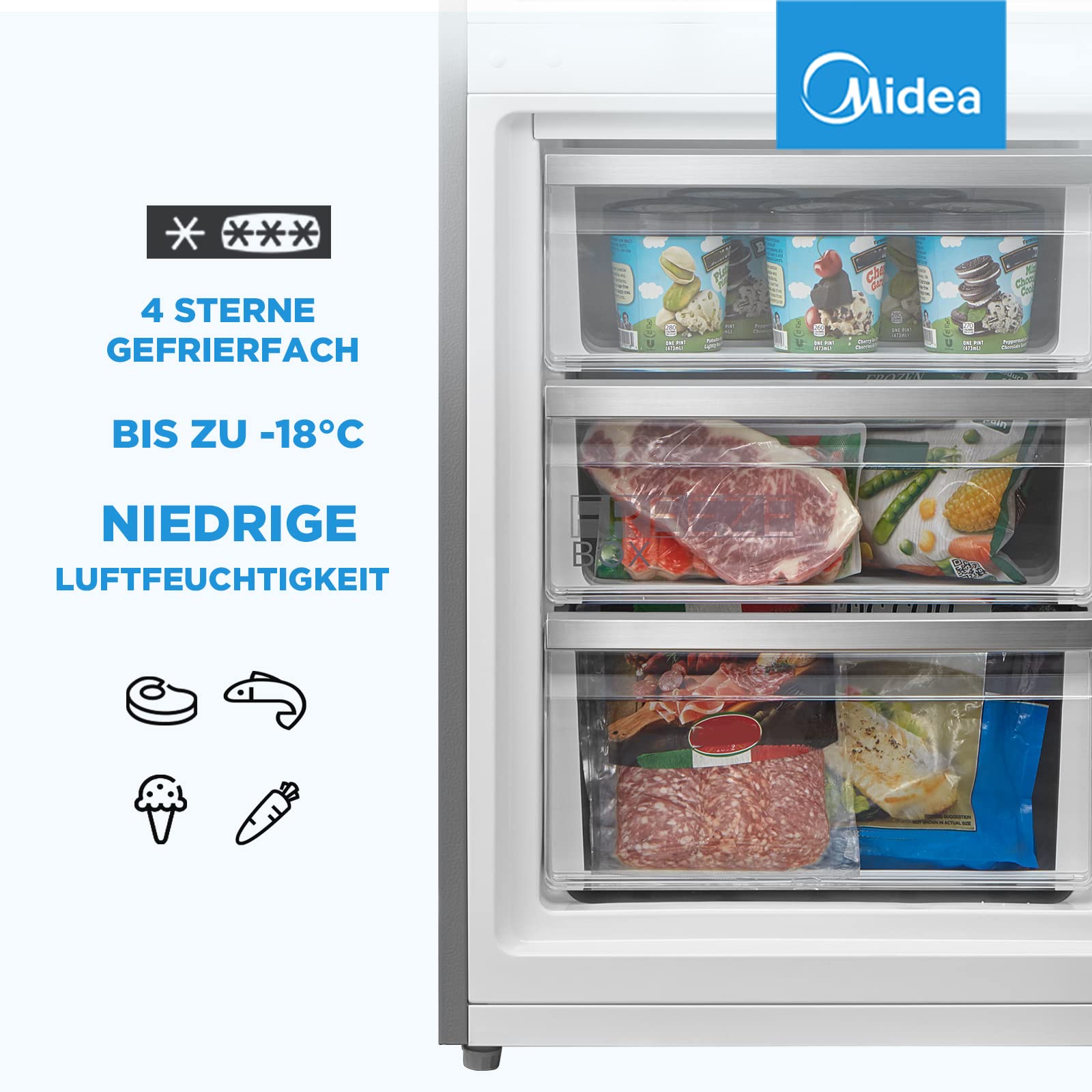 - Die freistehende Midea Kühl-Gefrierkombination bietet viele Funktionen zu einem Top-Preis-Leistungs-Verhältnis