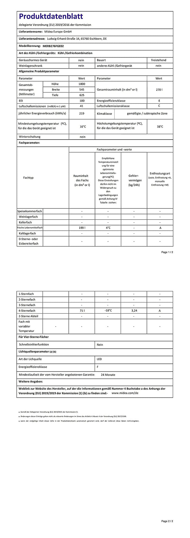 Einzelheiten: Midea MERB276FGE02A Kühl-/Gefrierkombination/180 cm Höhe /54,5 cm Breite/ 219 kWh/Jahr/ 199L Kühlteil/ 71L Gefrierteil/No Frost/Digital Control/AllAround Cooling