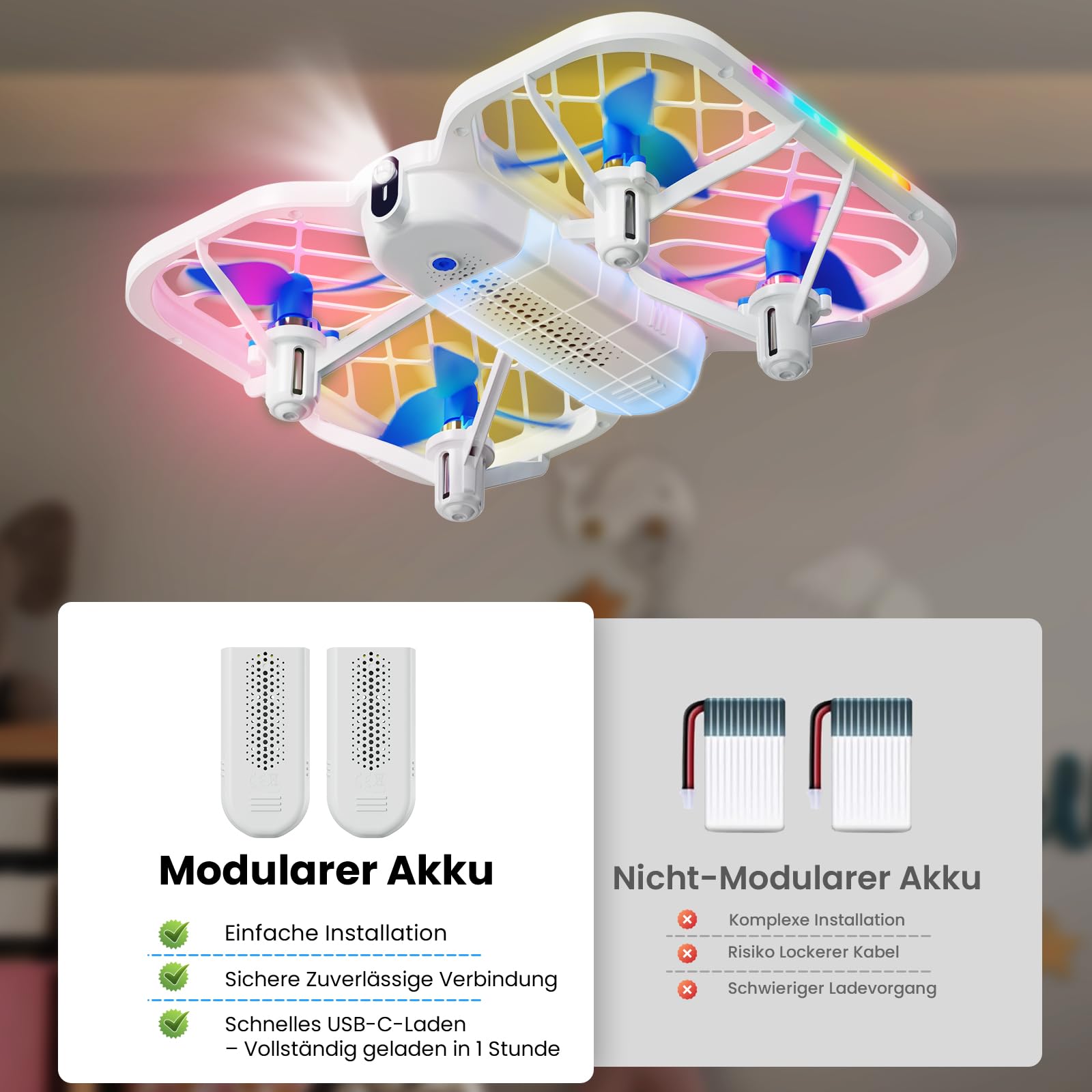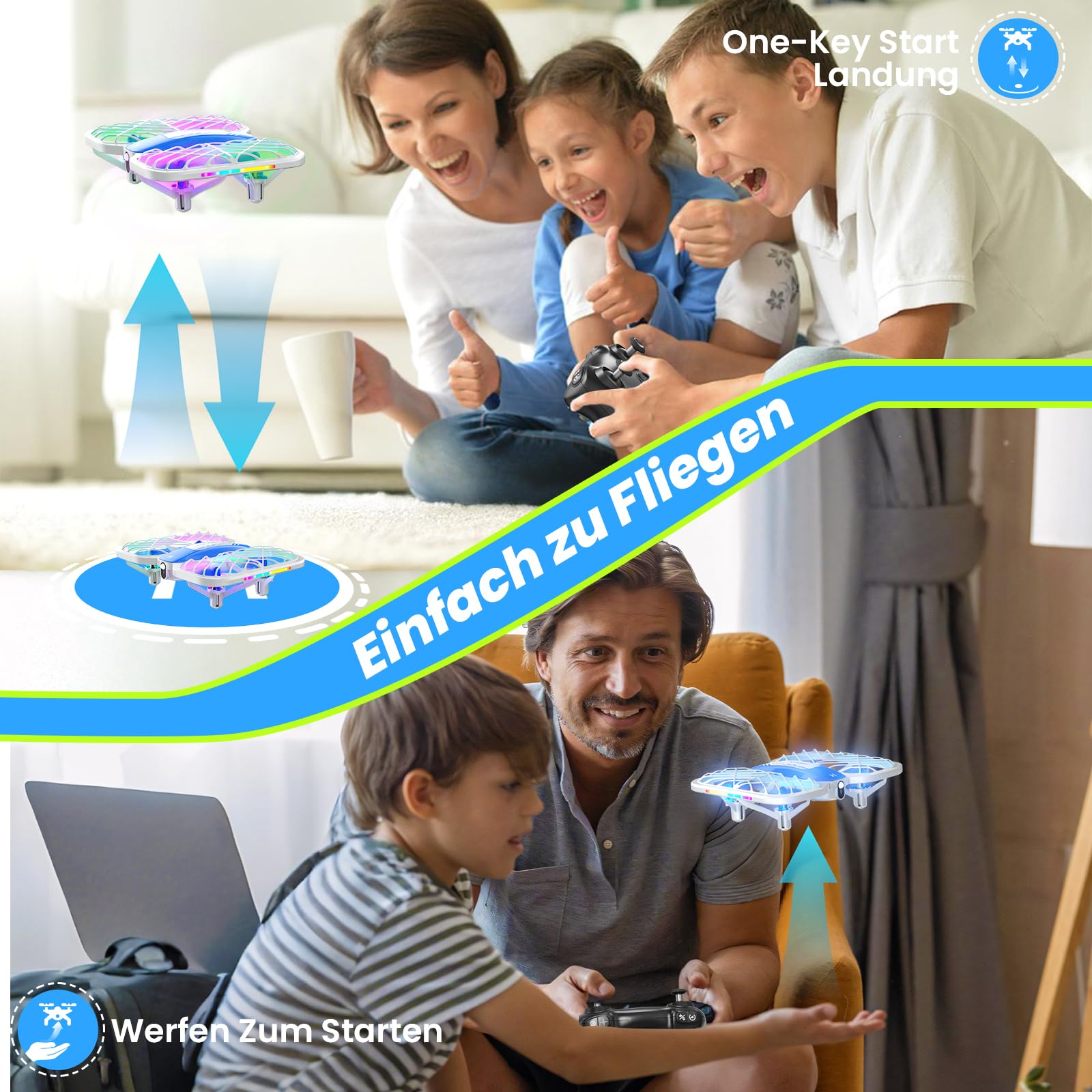 - 【Kinderspaß】Diese Mini-Drohnekinder ist mit 5 umschaltbaren LED-Lichtmodi sowie 360°-Flip- und Kreisflugfunktionen ausgestattet. Diese Drohnen ohne Kamera kann farbenfrohe Flugeffekte erzeugen und gleichzeitig die Fantasie und Kreativität von Kindern anregen.