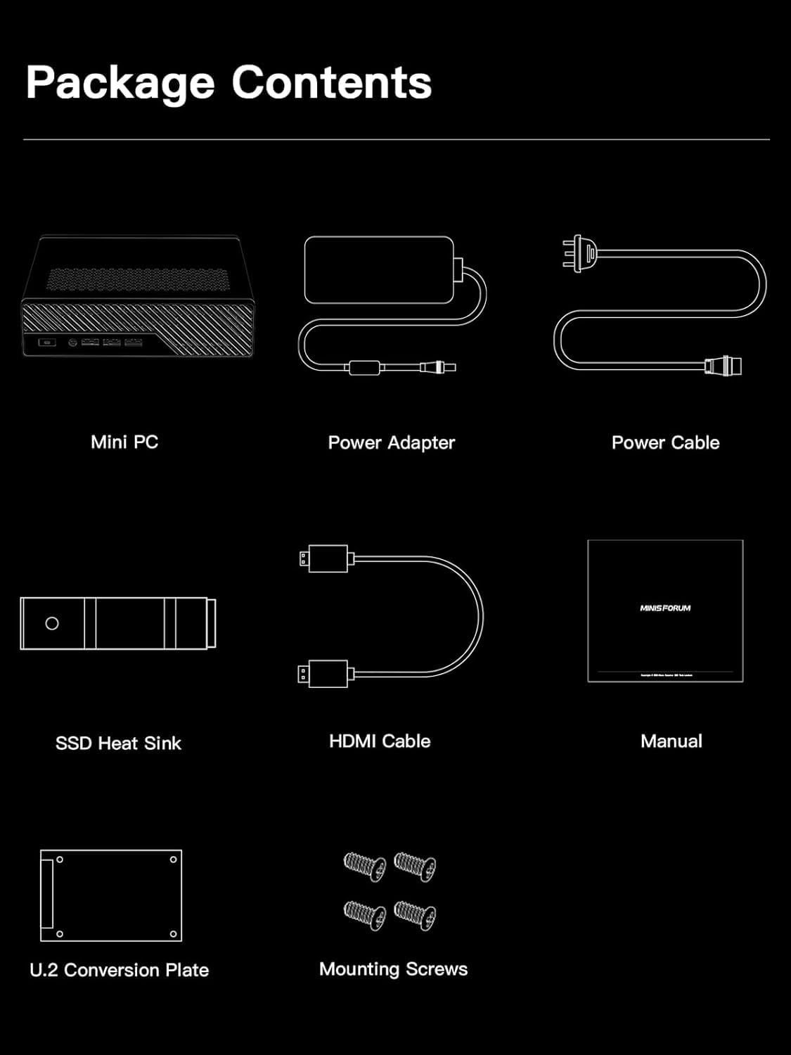 - 【Umfassende Schnittstellen】3 USB 3.0-Anschlüsse vom Typ A + 2 USB 2.0-Anschlüsse vom Typ A + 1 HDMI 2.0-Anschluss (4K bei 60 Hz) + 2 USB4 40 Gbit/s-Anschlüsse vom Typ C (Alt DP, 8K bei 30 Hz). Enthält 1x MiniWorkStation MS-01, 1x U.2-M.2-Konvertierungsadapter, 1x Netzteil, 1x Netzkabel, 1x SSD-Kühlkörper, 1x HDMI-Kabel.