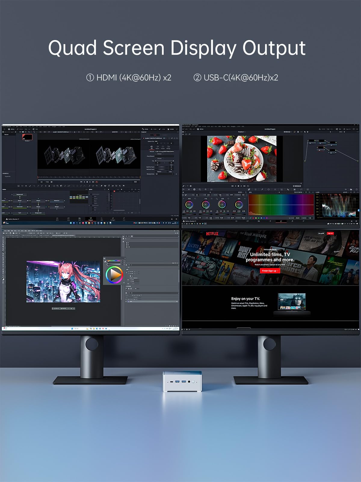 - 【Unterstützt UHD 4K-Vier-Bildschirm-Anzeige】 Der Mini-PC ist mit einer 4K@60Hz-Ultra-High-Definition-Grafikkarte (Intel UHD Graphics) ausgestattet, unterstützt 4K@60Hz-High-Definition-Videowiedergabe und bietet ein hochwertiges visuelles Erlebnis . 2 HDMI-Anschlüsse und 2 USB-C-Anschlüsse unterstützen die 4K-Ausgabe an vier Monitore und können vier Monitore gleichzeitig anschließen. Verdoppeln Sie Ihre Arbeitseffizienz.
