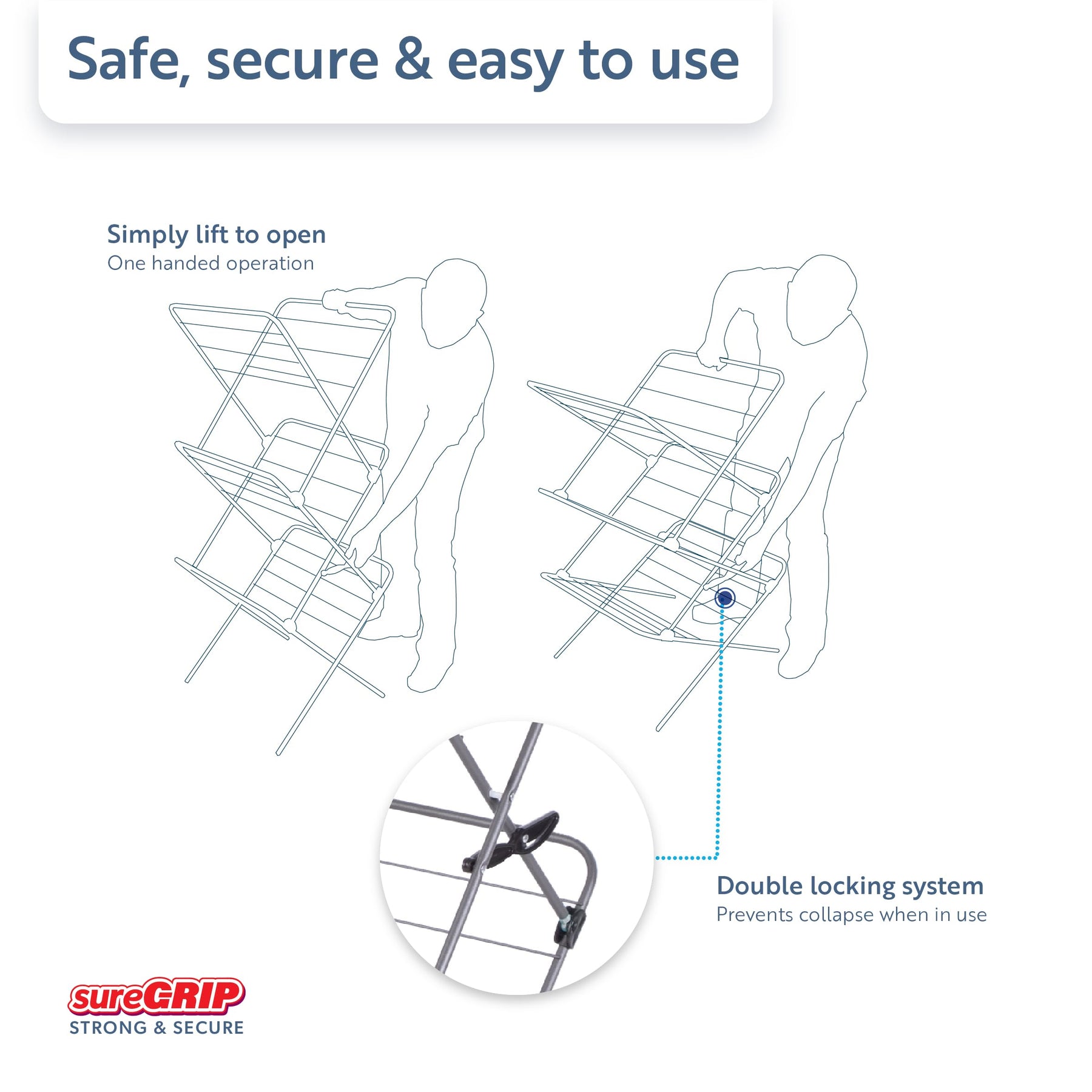 Einzelheiten: Die einzigartige, revolutionäre Sure Grip-Technologie mit strukturierten, rutschfesten Sprossen, hält Kleidungsstücke fest an Ort und Stelle und verhindert, dass Gegenstände herunterrutschen, wenn der Wäscheständer bewegt wird oder wenn Sie im Freien trocknen. Dank ihrer rostbeständigen Eigenschaften bietet die Sure Grip Technologie auch Schutz bei jedem Wetter, wodurch sie perfekt für die Trocknung im Innen- und Außenbereich geeignet ist. Der Sure Grip Wäscheständer mit 3 Etagen lässt sich in Sekunden öffnen und bietet 21 m Platz zum Aufhängen, bestehend aus 15 m Sprossen und 4 praktischen ausklappbaren Ecken, die 12 extra lange hängende Gegenstände halten. Die breiten hängenden Sprossen optimieren den Luftstrom für schnelleres Trocknen und die extra starke Stahlrohrkonstruktion sorgt dafür, dass es sicher und stabil bleibt, auch wenn es vollständig mit nasser Wäsche gefüllt ist, die bis zu 21 kg Gewicht hält. Der doppelseitige Auto-Lock-Mechanismus rastet sicher in Position und macht den Sure Grip 3-stöckigen Wäscheständer super schnell und einfach zu öffnen, zu laden und zu schließen. Die rutschfesten Füße geben zusätzliche Stabilität und verhindern Schäden an Böden. Bei Nichtgebrauch lässt sich der Wäscheständer ordentlich zusammenfalten und kann sofort wieder verwendet werden. * Achten Sie auf empfindliche Stoffe; es wird empfohlen, empfindliche Kleidungsstücke an Kleiderbügel aufzuhängen und an den ausklappbaren Ecken aufzuhängen. Achten Sie beim Platzieren und Entfernen von Kleidungsstücken, heben Sie vorsichtig ab.