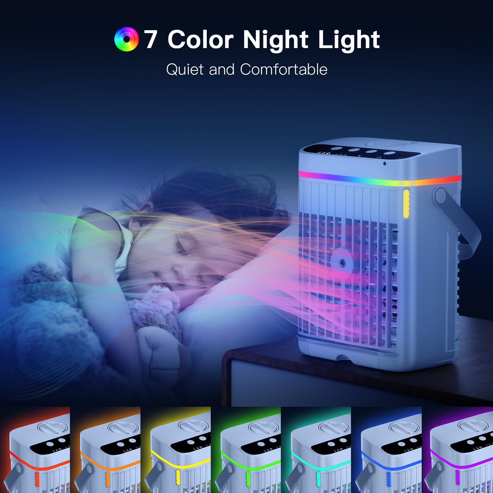 • 7-Farben-Nachtlichter: Persönliche Klimaanlage ist eingebautes 7-weiche Farben-Nachtlicht, Sie können Ihre Lieblingsfarbe wählen. Sie kann als Nachttischlampe ein ruhiges Ambiente für erholsamen Schlaf schaffen oder als Dekoration, um Atmosphäre auf der Party zu schaffen und gute Laune zu schaffen.