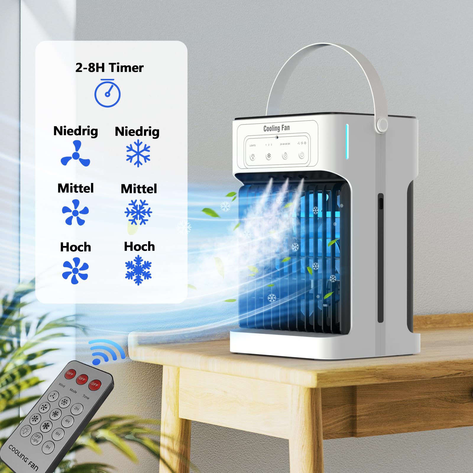 Mobile Klimaanlage mit Fernbedienung,1100ML Mini Luftkühler mit Wasserkühlung, 2-8H Timer & 7 LED,3 Luftgeschwindigkeiten & 3 Kühlnebel, Mobiles Klimagerät für zimmer,Wohnungen und Büro