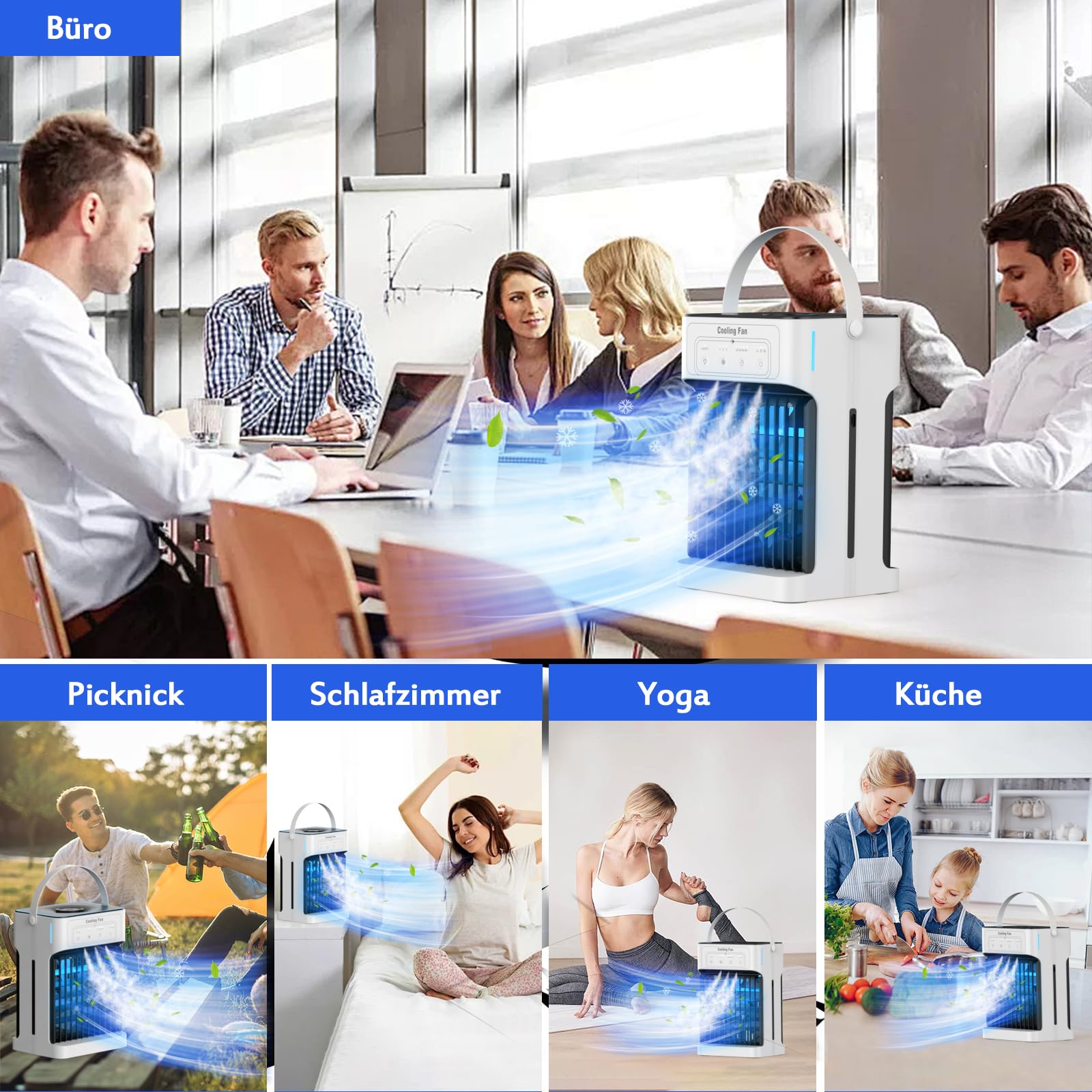 • ❄ 【Anpassbare Kühlung】Diese Mini Klimaanlage ist mit zwei Motoren und zwei Lüfterblättern ausgestattet, die leistungsstarke Luftströme liefern. Wählen Sie aus 3 Geschwindigkeitsstufen (Natürlich/Leise/Hoch) und 3 Luftmodi (Natürlich/Kalter Nebel/Intensiver Kalter Nebel), um Ihre Kühlerfahrung individuell anzupassen. Duale Ultraschall-Zerstäuber und Wet Triple Cooling-Technologie erzeugen sofort kühlen Wasserdampf für einen erfrischenden Nebel.