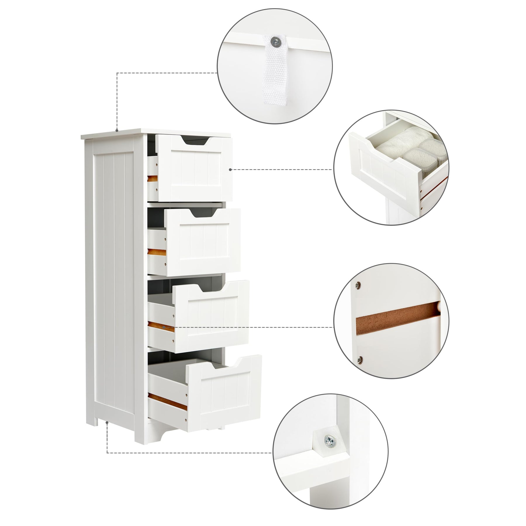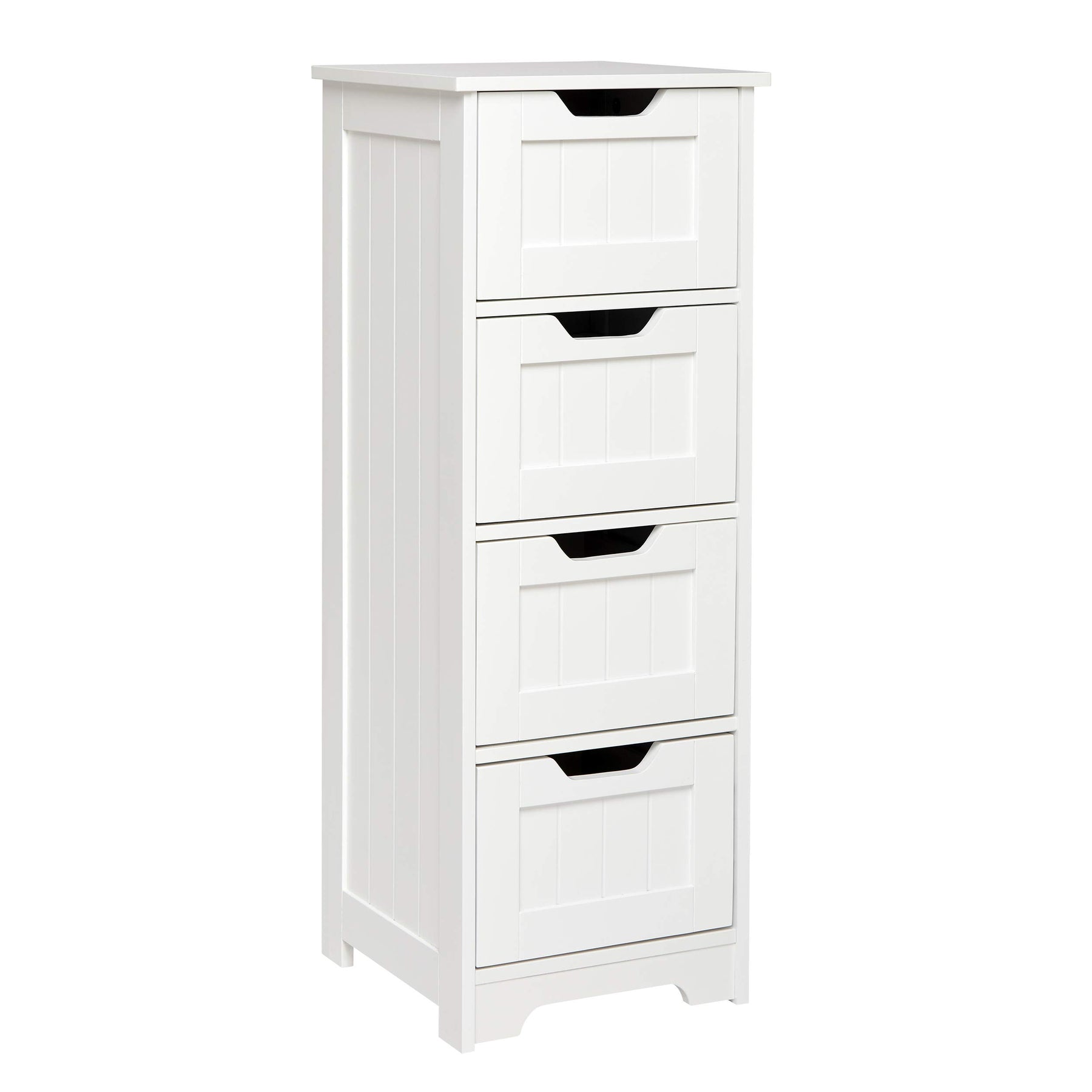 Einzelheiten: Badezimmerschrank, Badschrank Schmal Kommoden mit Schubladen aus Holz Weiß 30 x 30 x 82 cm für Bad Wohnzimmer Flur Schlafzimmer. Perfektes Design: Weißer eleganter Landhausstil, perfektes Design, leicht mit anderen Möbeln kombinierbar, ideale Möbel für Ihr Bad, Wohnzimmer, Schlafzimmer, Küche, Flur und andere Räume, bringen Stil in den Raum.Extra großer Stauraum: Mit dem Badezimmerschrank mit vier Schubladen können Sie Handtücher, Toilettenpapier, Bücher, CDs, Spielzeug und andere Gegenstände optimal aufbewahren. Darüber hinaus bietet die Oberfläche der Kommode genügend Platz für Lampen, Zeitschriften, Flaschen oder Gläser.Superior Qualität: Der Sideboard besteht aus umweltfreundlichem MDF mit einer wasserfesten Lackierung, die feuchtigkeits- und schimmelresistent und leicht zu reinigen ist. Die praktische Griffmulde lässt sich leicht und mühelos herausziehen. Außerdem sind alle Kanten abgeschrägt, um Sie aktiv vor möglichen Schäden zu schützen.Stabile Konstruktion: Die Kommode hat stabile Füße und kann auch mit der mitgelieferten Kippsicherung an der Wand befestigt werden. Sicherheit bei der Benutzung.Kompakte Größe: Aufbewahrungsschrank misst L30 x B30 x H82,5 cm. Schmal Größe ist perfekt für jeden Winkel Ihrer Wohnung. So können Sie ihn optimal als Beistelltisch im Wohnzimmer, als Nachttisch im Schlafzimmer oder in einem anderen Raum nutzen.