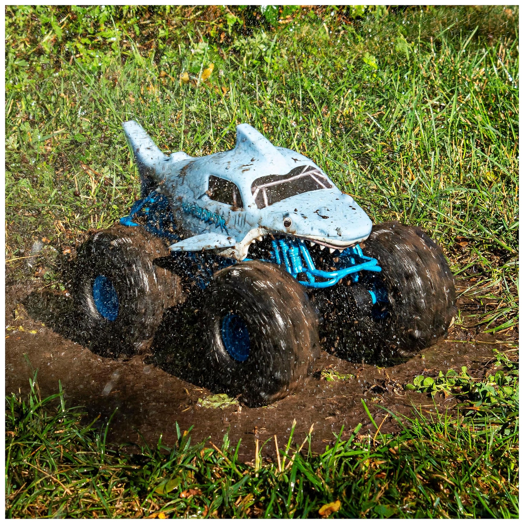 Der ferngesteuerte Monster Jam Megalodon Storm liefert Höchstleistung in jedem Gelände. Selbst Wasser ist für den Monstertruck in Hai-Optik kein Hindernis. Ohne an Geschwindigkeit zu verlieren, wechselt der Megalodon Storm von Schnee, Matsch, Geröll oder Gras aufs Wasser und bewegt sich dort durch seine wasserfeste Karosserie und leichten Reifen einfach weiter. Und hat er oder sein Fahrer genug, wechselt er wieder an Land und gibt dort weiter Gas. Spektakuläre Speed-Duelle, 360 Grad Spins oder Stunts lassen sich mit der 2,4 GHz Fernsteuerung realisieren. Aber Achtung: Entfernt sich das Fahrzeug mehr als 30m von der Fernbedienung, signalisiert der Reichweiten-Sensor über einen Piepton das Fahrzeug zurückzuholen. Wie die original Monster Jam Trucks in der Arena ist der Megalodon Storm im Maßstab 1:15 mit BKT-Reifen ausgestattet und fühlt sich damit an wie sein großes Vorbild. Und geht ihm mal der Saft aus, lässt sich der ferngesteuerte Monstertruck einfach per USB aufladen. Monster Jam Action an Land und Wasser mit dem Megalodon Storm.