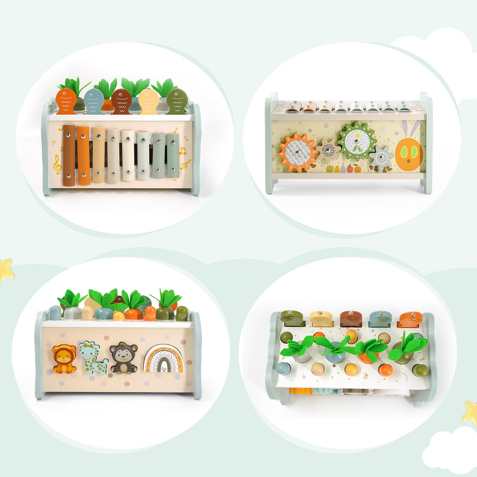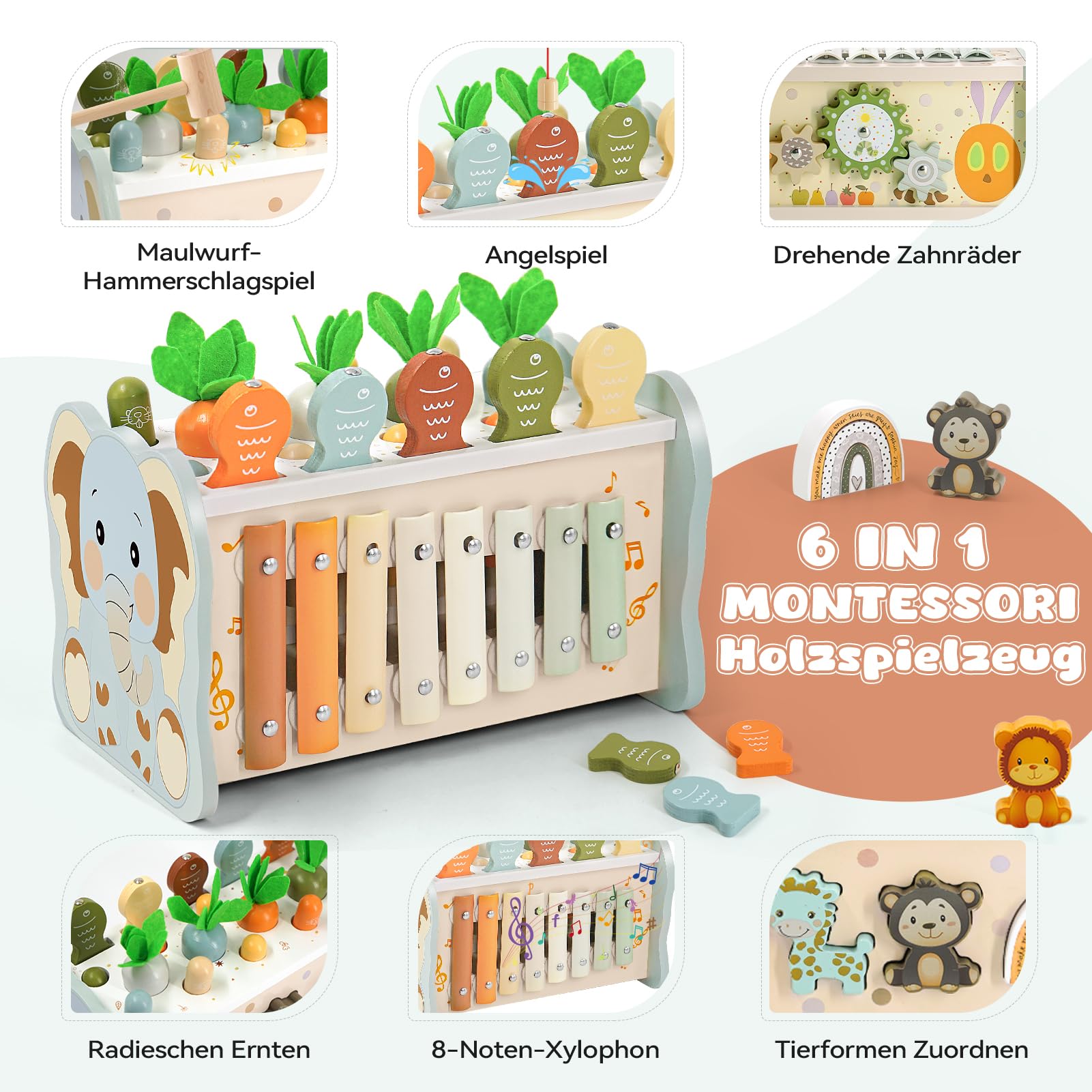 - 🌈6-IN-1 MONTESSORI SPIELZEUG BABY🌈Unser Kinderspielzeug ab 1 jahr in sanften Farben vereint mehrere Spielmöglichkeiten und verbindet Spaß mit Lernen. Das Hammerspiel trainiert Hand-Auge-Koordination und Reaktion, das Xylophon kinder 1 jahr weckt musikalisches Interesse, Magnetfischen und Karottenziehen fördern die Feinmotorik, Tierformenmatching verbessert die Kognition, und drehende Zahnräder entwickeln logisches Denken. Es macht Spielen amüsant und lehrreicher.