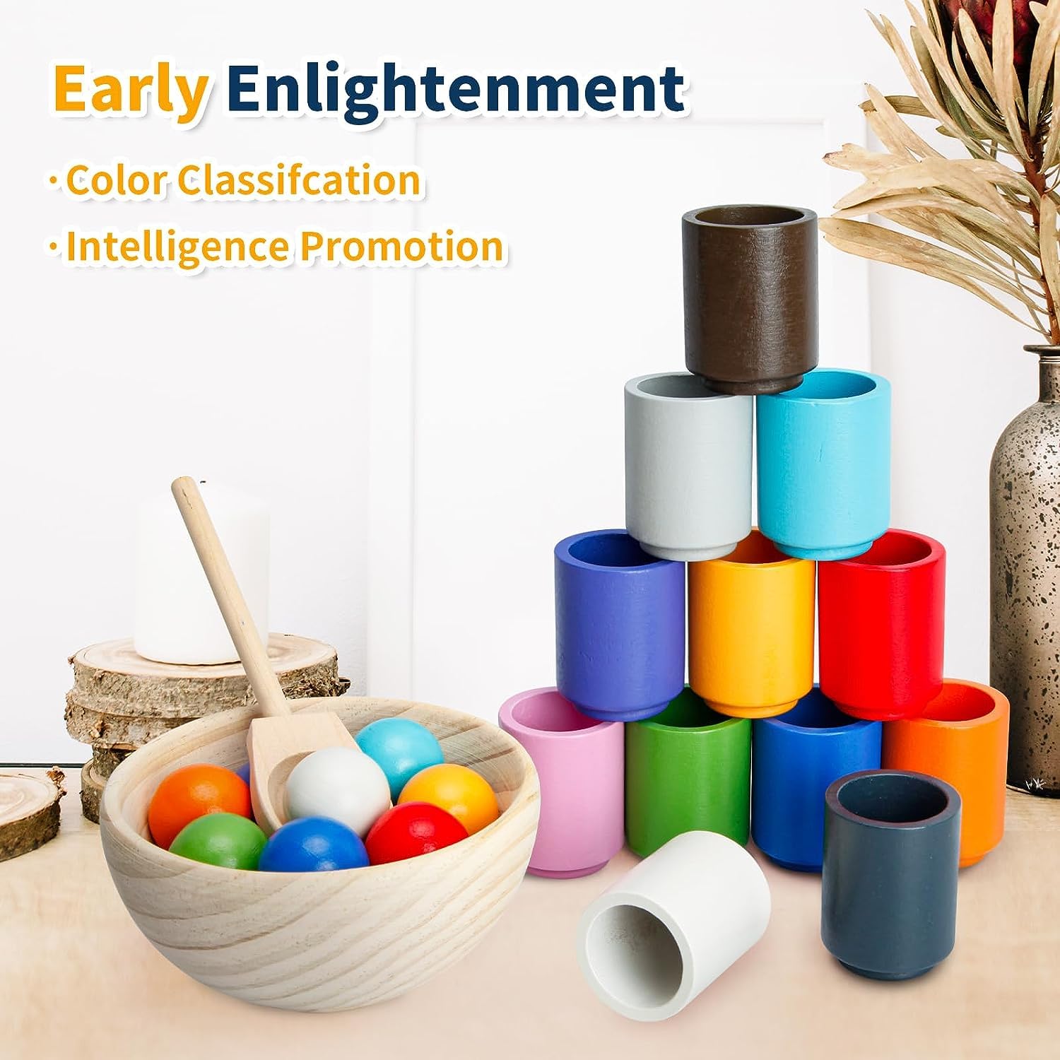 - 🎓【Montessori Sortier Stapelspielzeug】Unser Holz Montessori Spielzeug enthält 12 x Kugeln 30 mm, 12 x Tassen, 1 x Holzlöffel, 1 x Holzschale, 1 x Leinentasche für Bälle. Es gibt mehrere Spielmöglichkeiten: Sortieren, Stapeln, Sortieren, Zählen usw.