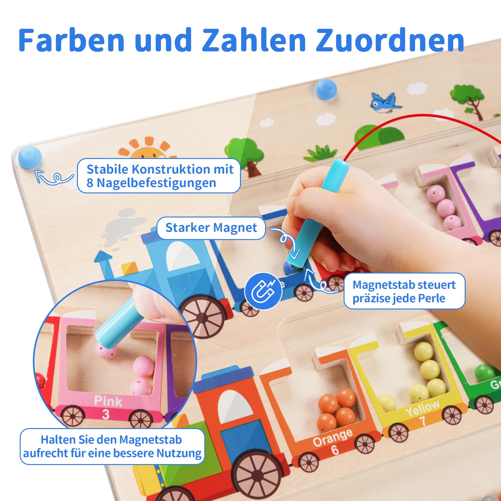 • 【Farben und Zählen Entdecken】 Dieses Magnetspiel Labyrinth Spielzeug verfügt über 10 eingebaute "Zugwaggons", die die Zahlen 1-10 darstellen, sowie 55 Magnetperlen in 10 leuchtenden Farben. Die 10 Zugwaggons sind in verschiedenen Farben erhältlich, jede Farbe entspricht der Zahl 1-10, Kinder können mit den Magnetstäbe die Perlen auf dem Gleis in den Zugwagen der entsprechenden Farben bewegen, So wird die Hand-Auge-Koordination trainiert und die Finger-/Handgeschicklichkeit geübt.