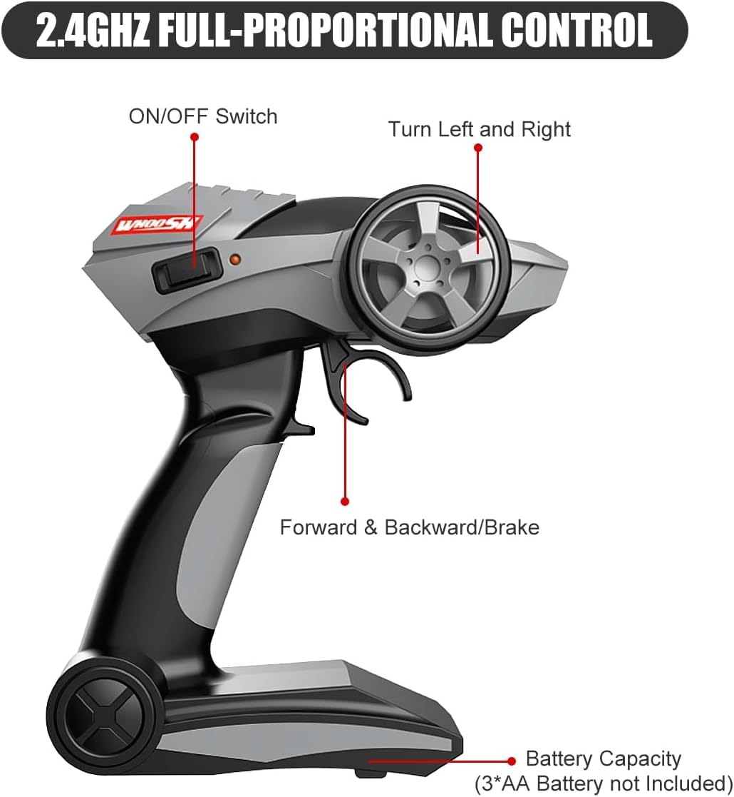 - 【2.4G Non-Interference Controller】Die empfindliche Fernbedienung mit proportionaler Gas- und Lenkungssteuerungsfunktion, kann der Spieler Geschwindigkeit und Richtung mit dem Controller einstellen. 2.4Ghz Hochfrequenz, kann den Entfernungsbereich von 145 Zoll (ca. 35 Meter) steuern, unterstützen mehrere Personen die Fernbedienung Auto zur gleichen Zeit zu spielen, ohne Interferenz.