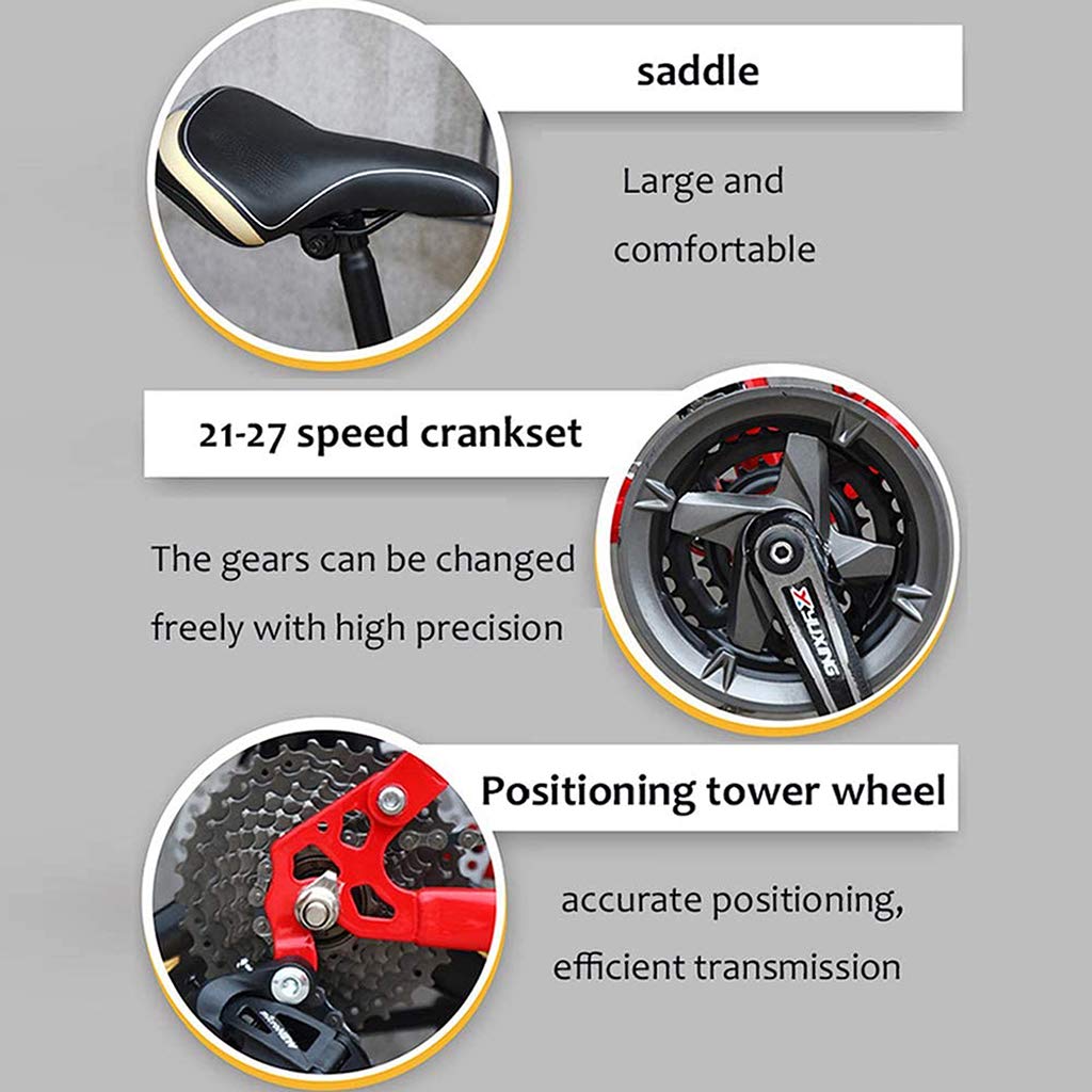 - 4. Dämpfungssystem: Mountainbikes für jedes Gelände mit stoßabsorbierender Vordergabel. Die verdickte Außenwand ist widerstandsfähiger gegen Stöße. Die verdickten Stoßdämpfer helfen Stöße zu absorbieren. Die Parallelstangen passen den Druck an die Straßenbedingungen an. Stoßdämpfer hinten und doppeltes Stoßdämpfungssystem erhöhen den Komfort während der Fahrt erheblich.