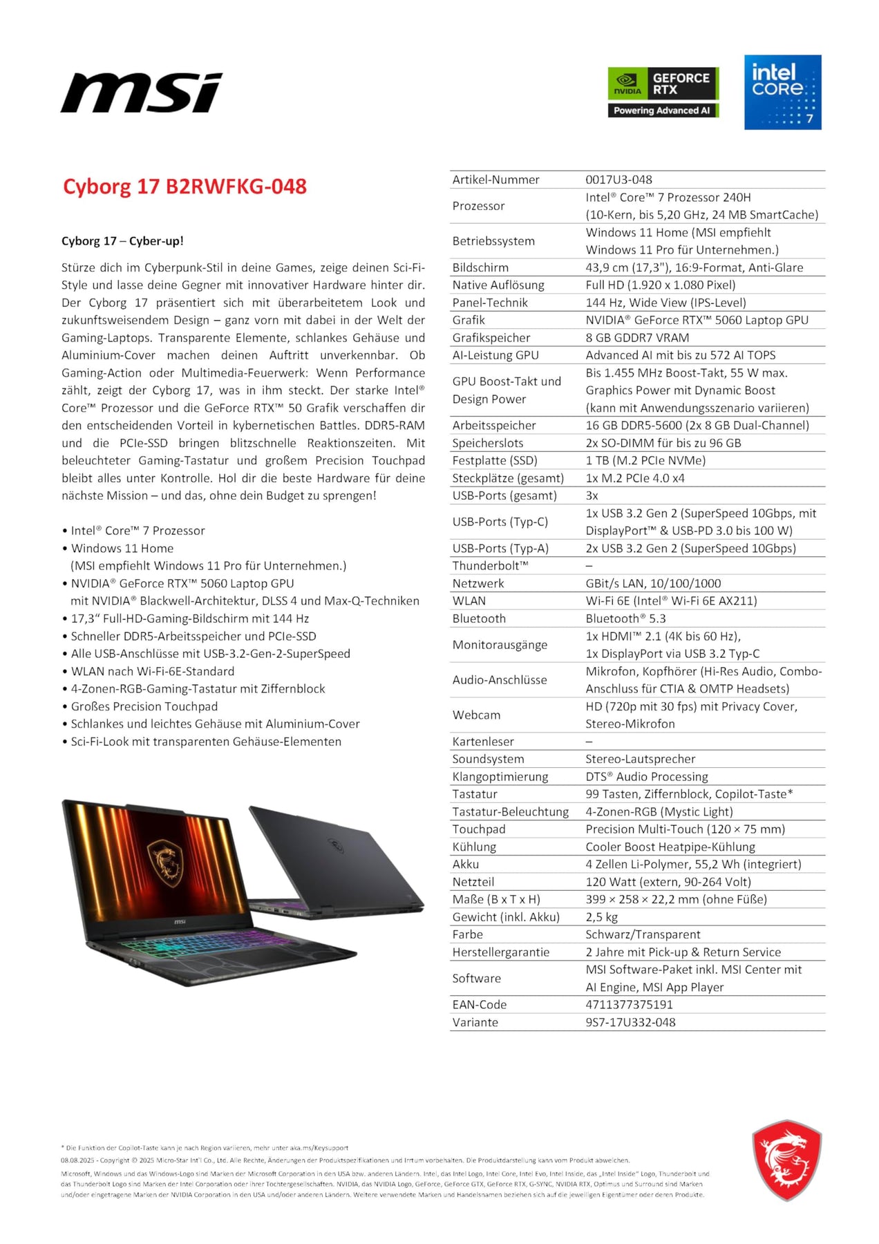 - Stürze dich im Cyberpunk-Stil in deine Games, zeig deinen Sci-Fi-Style und häng deine Gegner mit überlegener Hardware ab. Der Cyborg 17 präsentiert sich mit überarbeitetem Look und futuristischem Design. Transparente Elemente, schlankes Gehäuse und Aluminium-Cover machen deinen Auftritt unverkennbar.