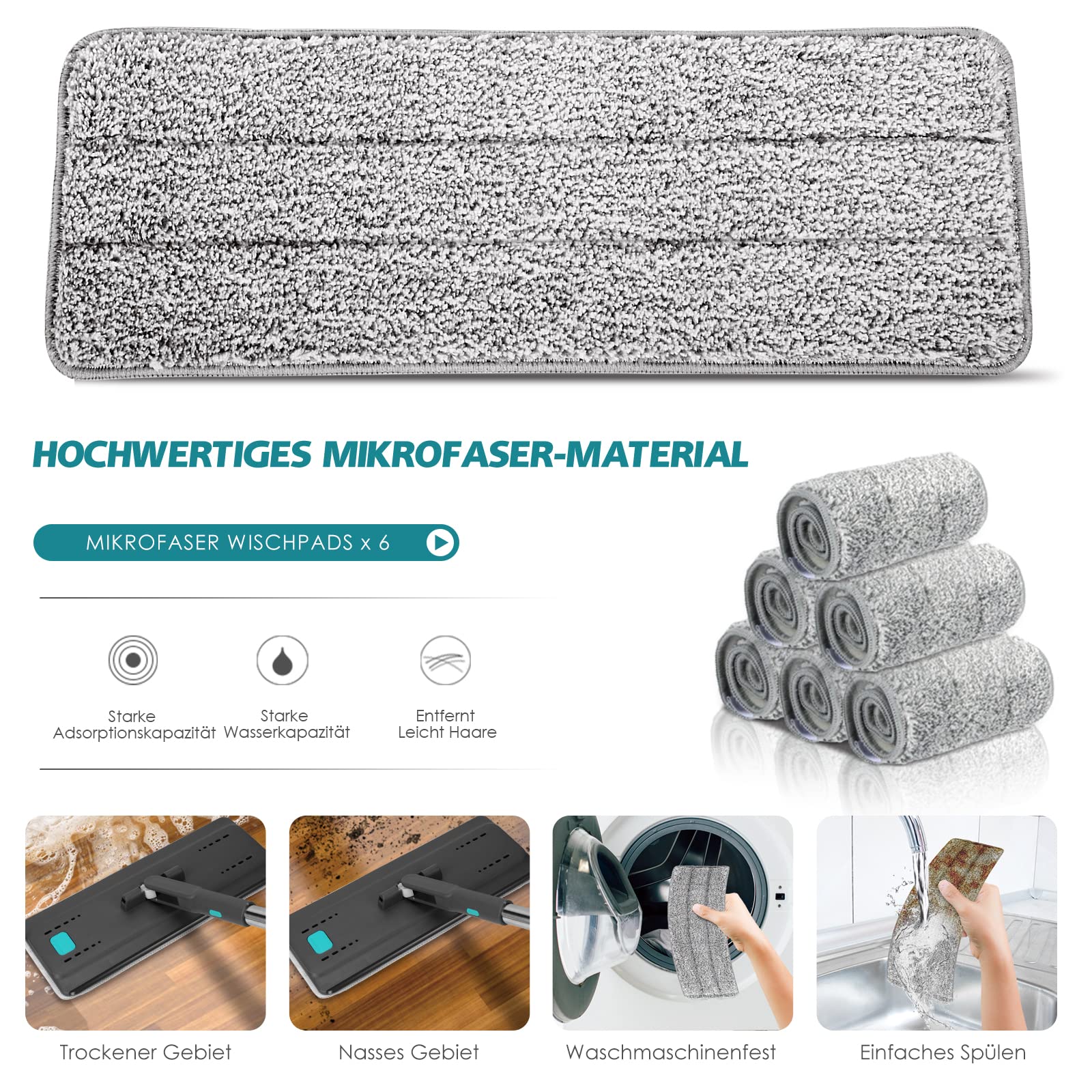 - 6 Wiederverwendbare Wischpads: Das Wischmopp set mit Eimer enthält 6 hochwertige Mikrofaser Wischpads, die schnell Wasser aufnehmen und Schmutz und Haare entfernen, und weil sie weich genug sind, zerkratzen sie nicht die Bodenoberfläche. Jedes Wischpad ist maschinenwaschbar oder handwaschbar und kann lange wiederverwendet werden. Ersatz-Mop-Pad ASIN: B0BV5SWQDZ.