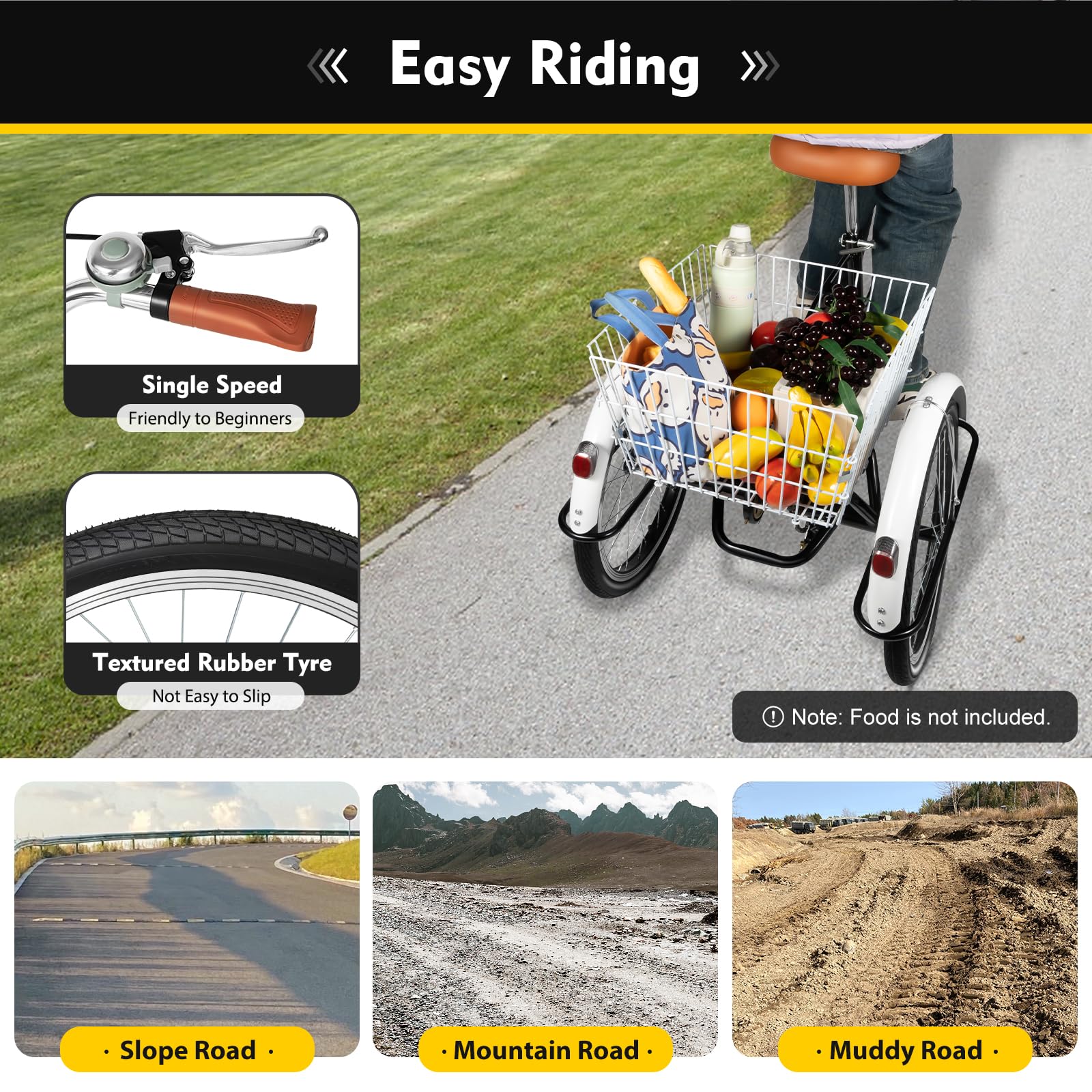 🔥[Sicheres Fahren und großer Einkaufskorb] - Reflektoren sorgen für zusätzliche Sicherheit bei Nacht und Schutzbleche an den Rädern halten das Dreirad sauber. Der große Einkaufskorb macht es einfach, Gemüse oder Obst zu transportieren und kann viele Artikel für mehr Komfort beim Einkaufen halten.