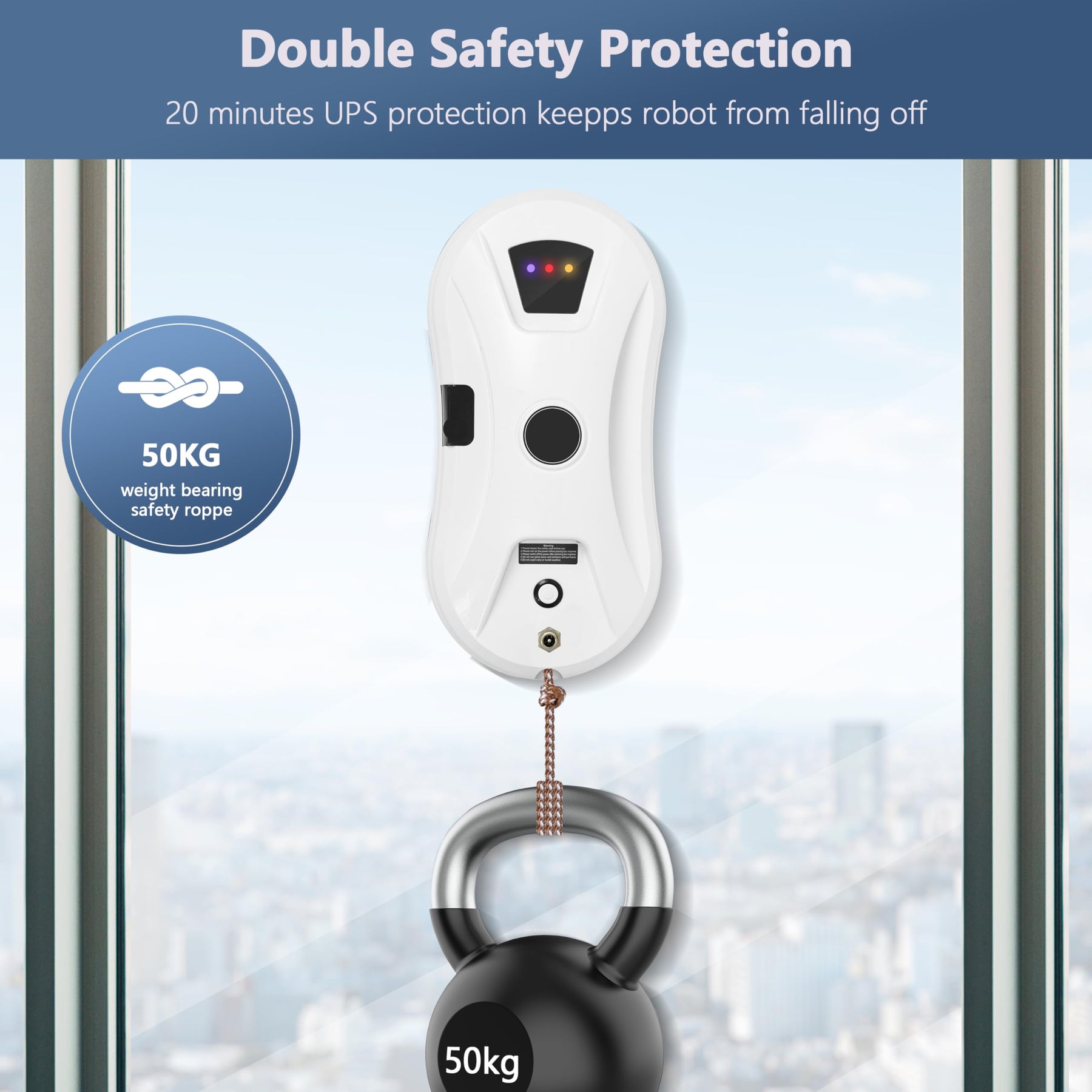 - 【Starke Absaugung, fällt nie herunter】Unser Fensterputzroboter verfügt über eine fortschrittliche Vakuummotor-Technologie, die eine starke Saugleistung von 5600 Pa liefert, um sicherzustellen, dass er fest an den Oberflächen haftet. Dieser Fensterputzroboter ist mit einer eingebauten USV (unterbrechungsfreie Stromversorgung) ausgestattet, die es dem Fensterputzroboter ermöglicht, während eines Stromausfalls bis zu 30 Minuten lang weiter zu arbeiten, so dass keine Absturzgefahr besteht.