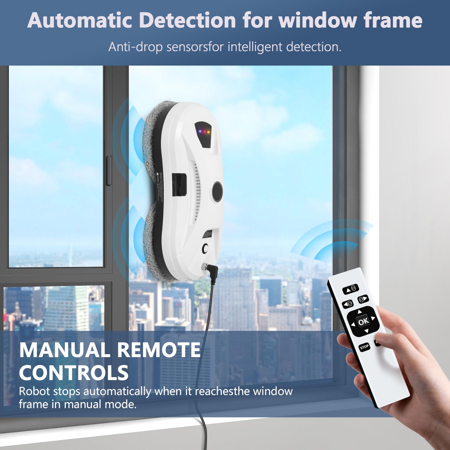 - 【Intelligente Fernsteuerung】Unser smarter Fensterputzroboter bietet drei automatische Modi und manuelle Steuerung. Bedienen Sie den Fensterputzroboter mit der Infrarot-Fernbedienung oder der App. Er erkennt Fensterrahmen und Hindernisse und passt die Richtung automatisch an.