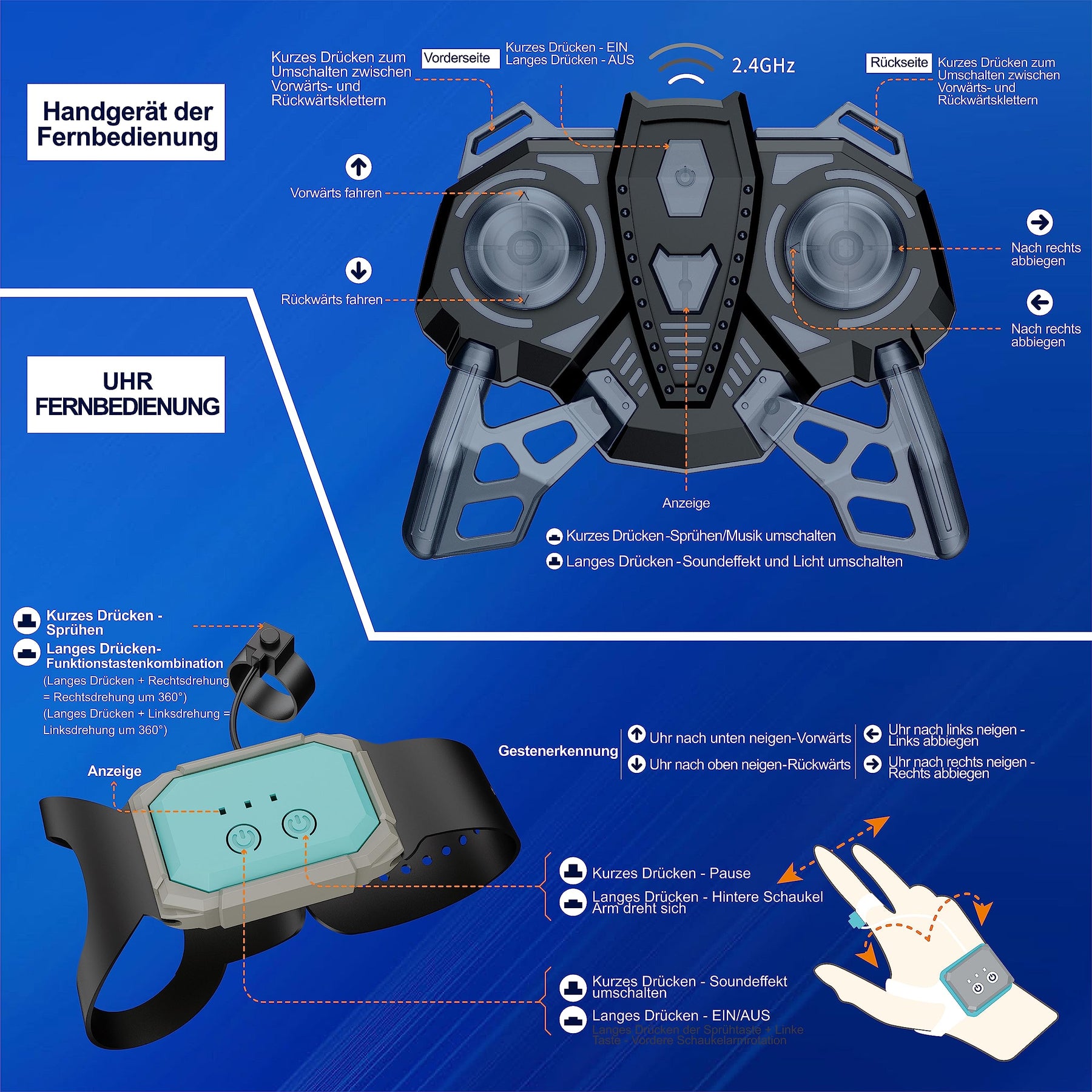 - 【Handgesteuerter und Ferngesteuerter Modus】Das gestenoperation RC auto für kinder hat einen 2,4 GHz störungsfreien Fernbedienungsbereich von bis zu 30m/98 ft. Es kann entweder per Fernbedienung oder Handgesten gesteuert werden. Einfache Handbewegungen ermöglichen verschiedene Aktionen des Autos, was die Feinmotorik trainiert. (Fernbedienung benötigt 2 AAA-Batterien, nicht enthalten).