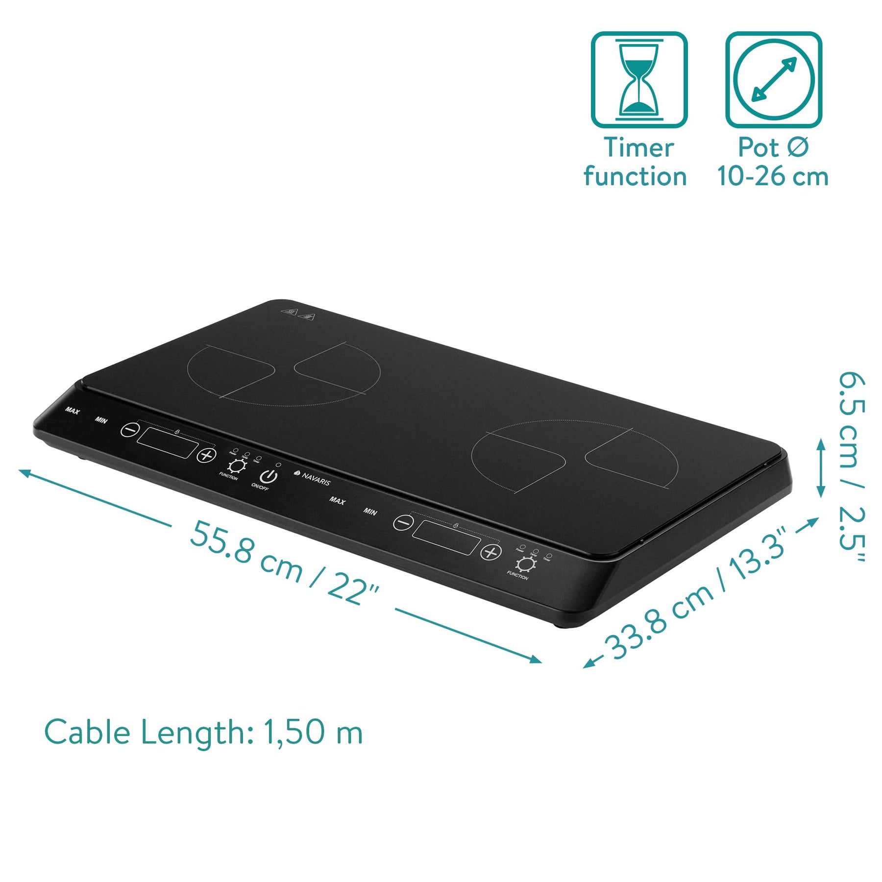 - Timer TECHNISCHE DATEN Max. Leistung: 3500W (1x 2000W, 1x 1500W) / Stromversorgung: 220-240V 50/60Hz Topf- / Pfannendurchmesser: min. 10 cm, max. 26 cm / 7 und 9 Leistungsstufen pro Kochfeld Heiztechnik: Induktion / Temperaturbereich: 60-240°C / Timer: 5-180 min Maße: 55,8 x 33,8 x 6,5 cm / Gewicht: 3,8kg / Steckertyp: Typ C Material: Glas, elektr. Komponenten LIEFERUMFANG 1x Doppel-Induktionskochplatte