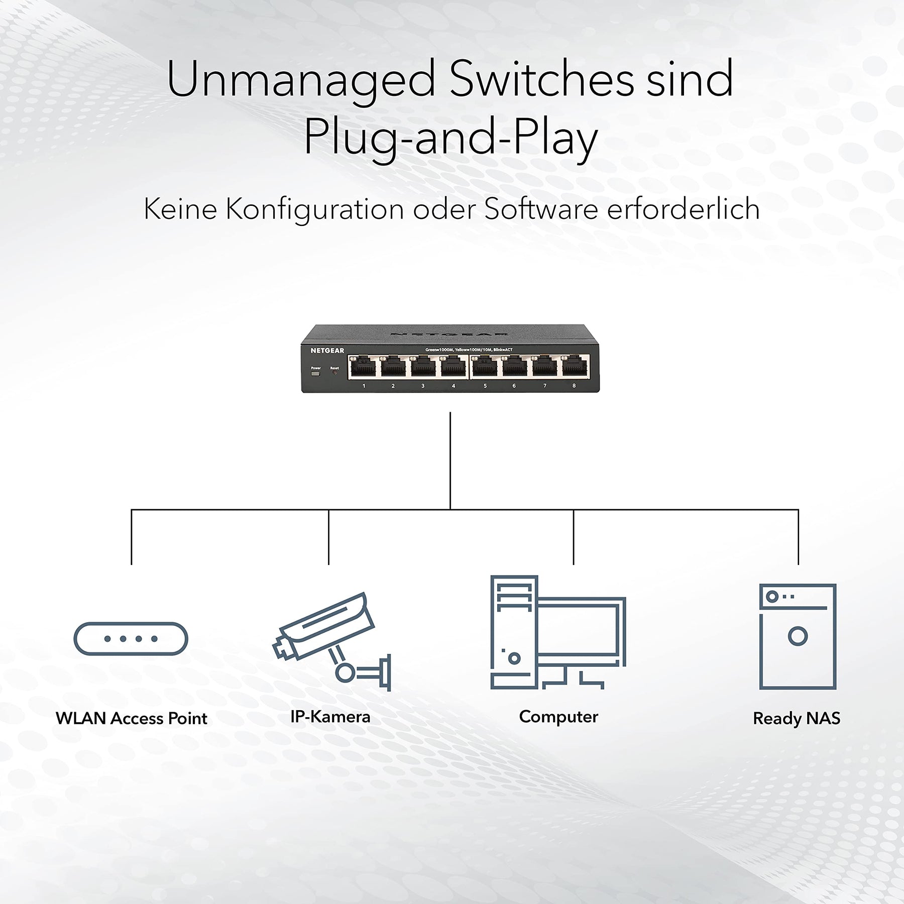 NETGEAR GS308PP PoE Switch 8 Port Gigabit Ethernet LAN Switch PoE+ 83W (Plug-and-Play Netzwerk Switch PoE, lüfterlos, robustes Metallgehäuse), schwarz