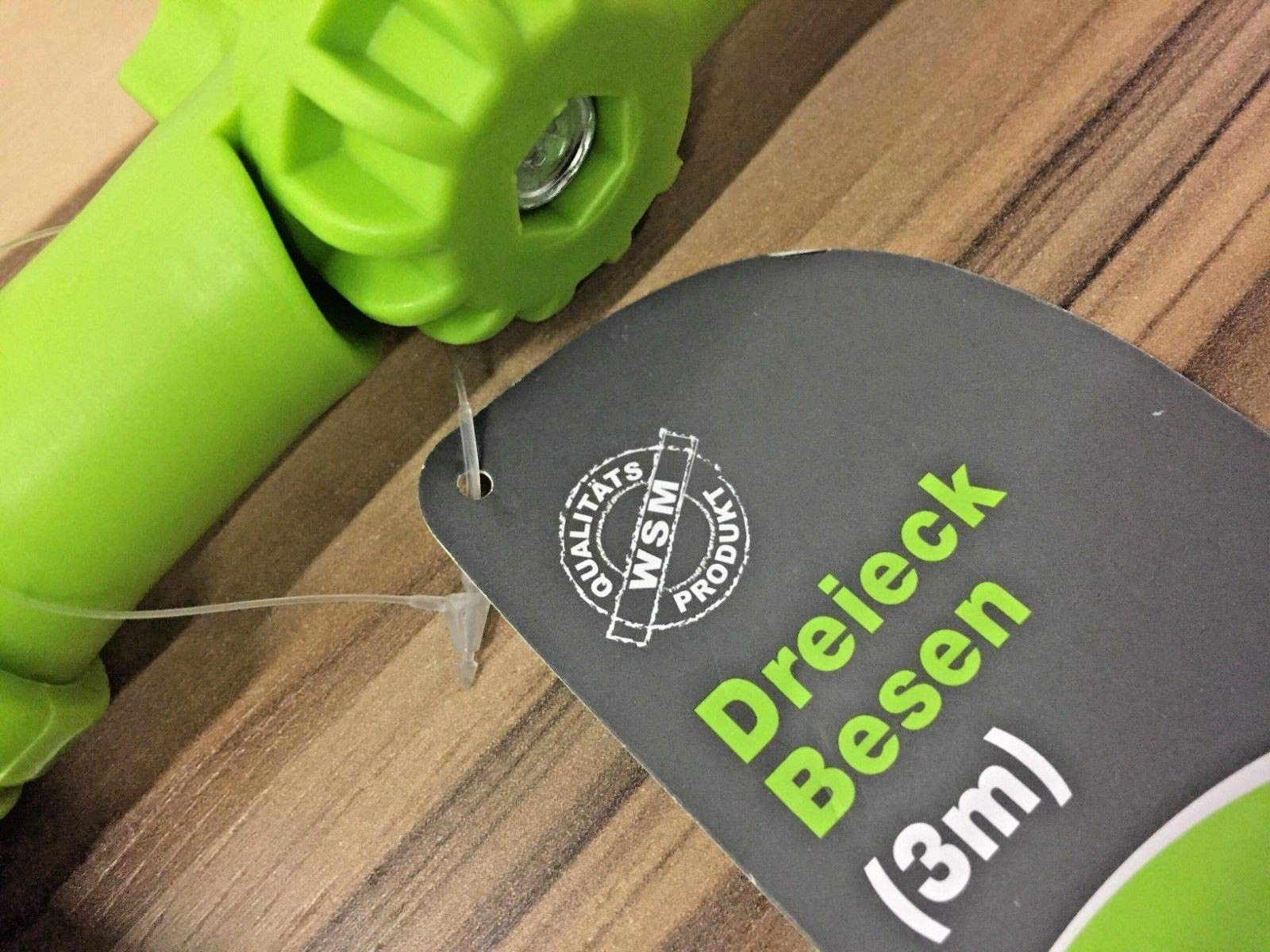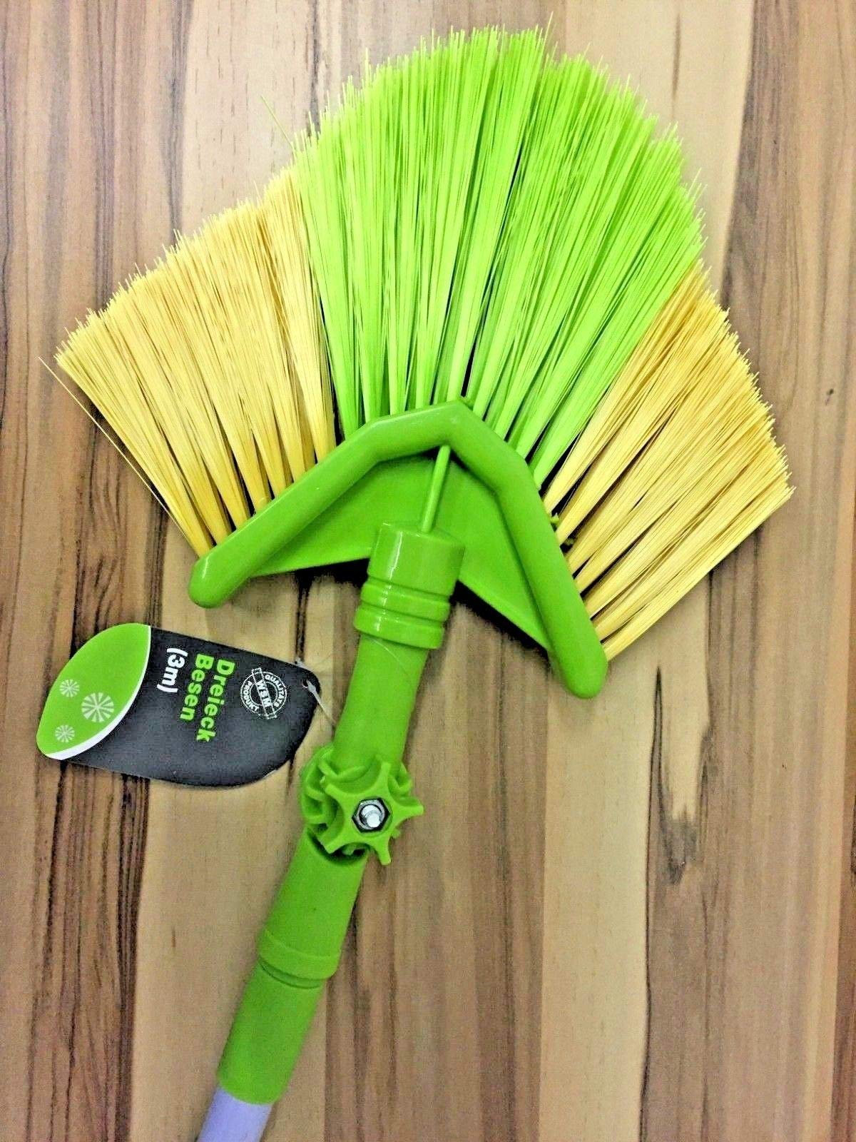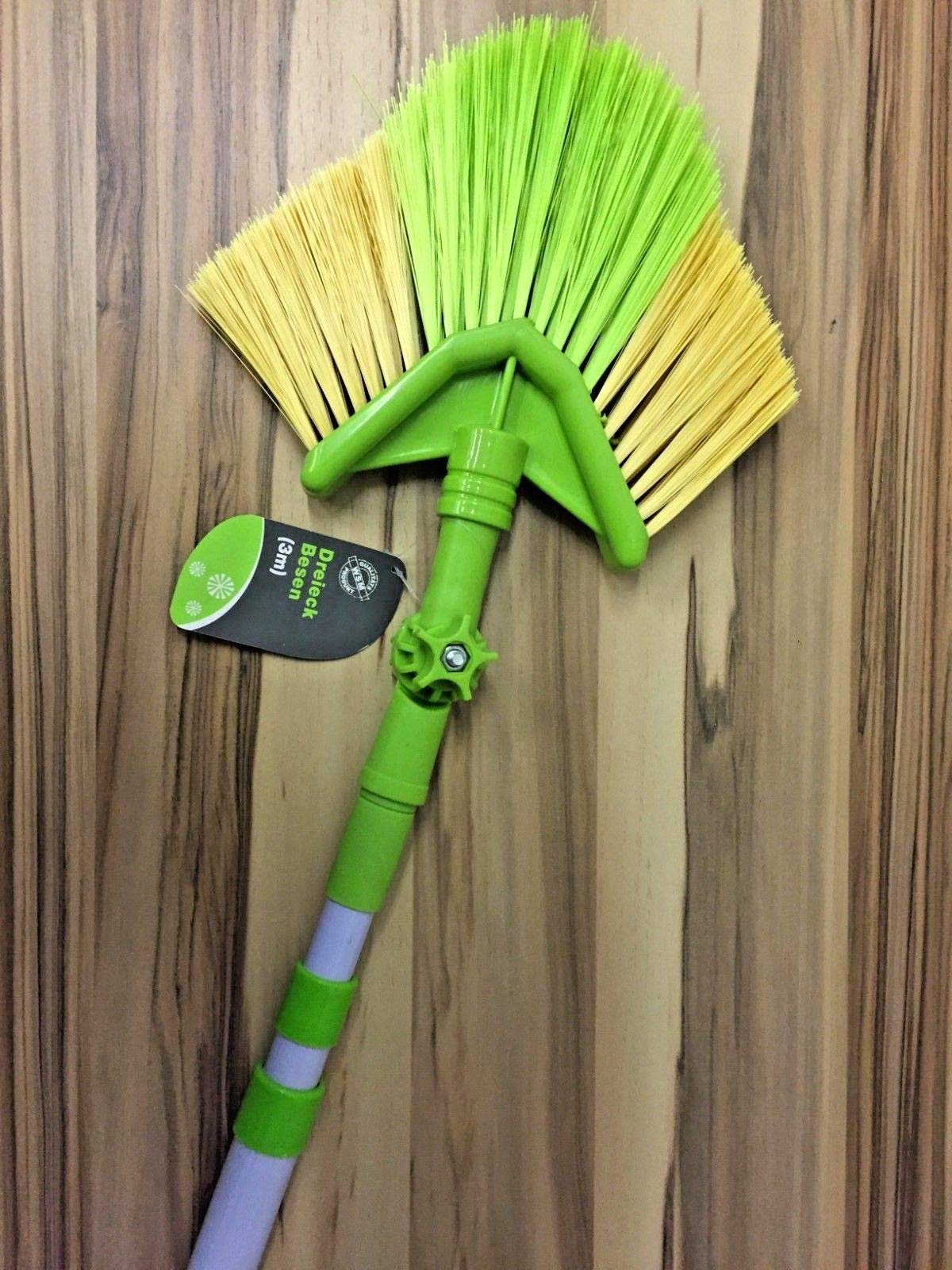 Einzelheiten: Teleskop Dreiecksbesen 3m - hellgrün-gelb - zweimal ausziehbarer Teleskopstiel, stabile Bürste mit Knickgelenk. Für hohe Räume, Galerien, hohe Treppenhäuser, aussen am Haus, unterm Dachvorsprung, am Carport, Garage, Dachrinnen vom Laub befreien und vieles mehr. Für das Privathaus, Lager- & Produktionshallen, Hotels etc von 1.44 m bis 3.25 m lang Winkeladapter bis 90 Grad, --- praktisch - sicher - einfache Handhabung --