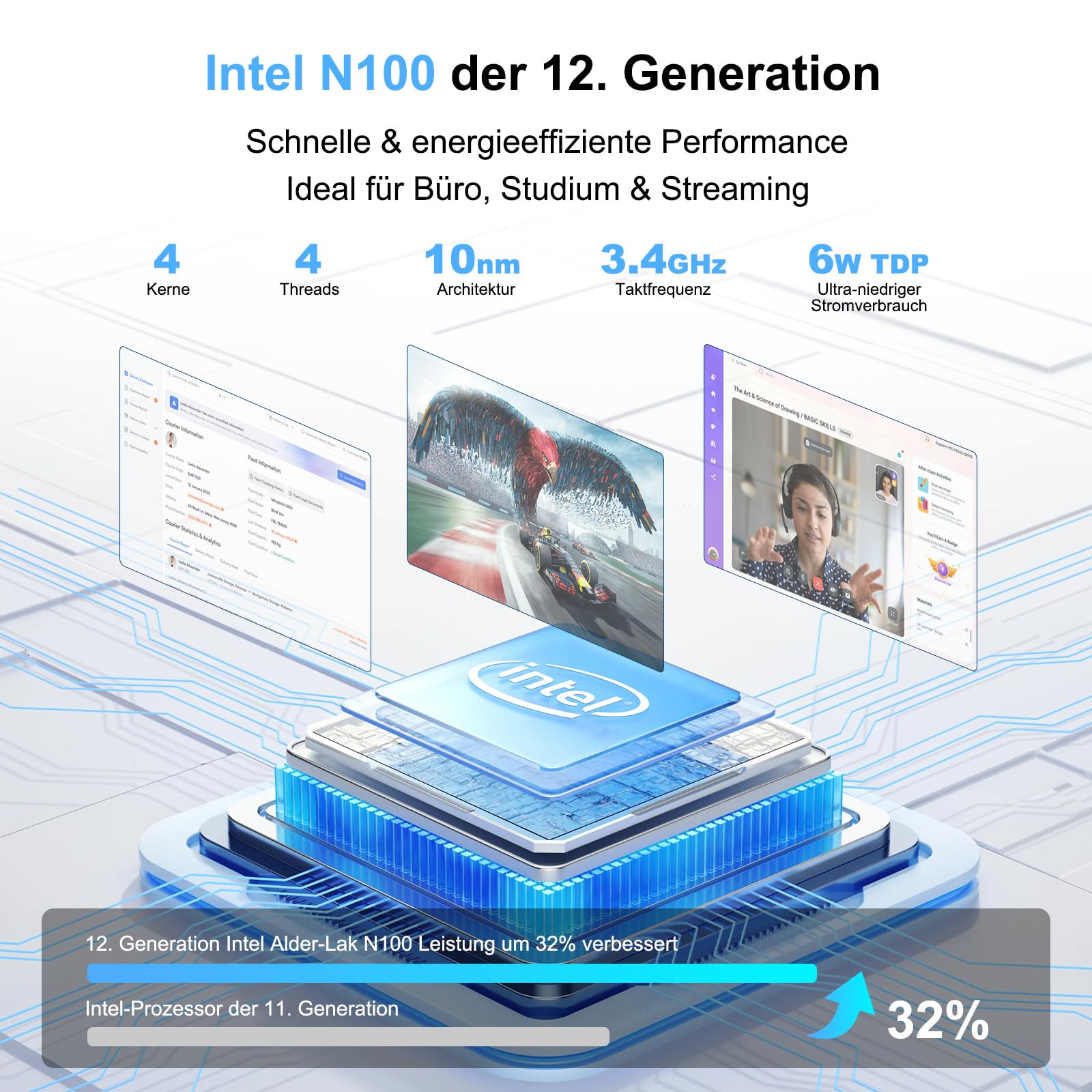 - Leistungsstark & Multitasking – Intel ADL-N N100 Prozessor (4 Kerne, bis 3,4 GHz), 16GB DDR4 RAM und 1TB SSD für flüssiges Multitasking, schnelle Startzeiten und zuverlässigen Speicher – ideal für Arbeit, Studium, Homeoffice und entspanntes Streaming