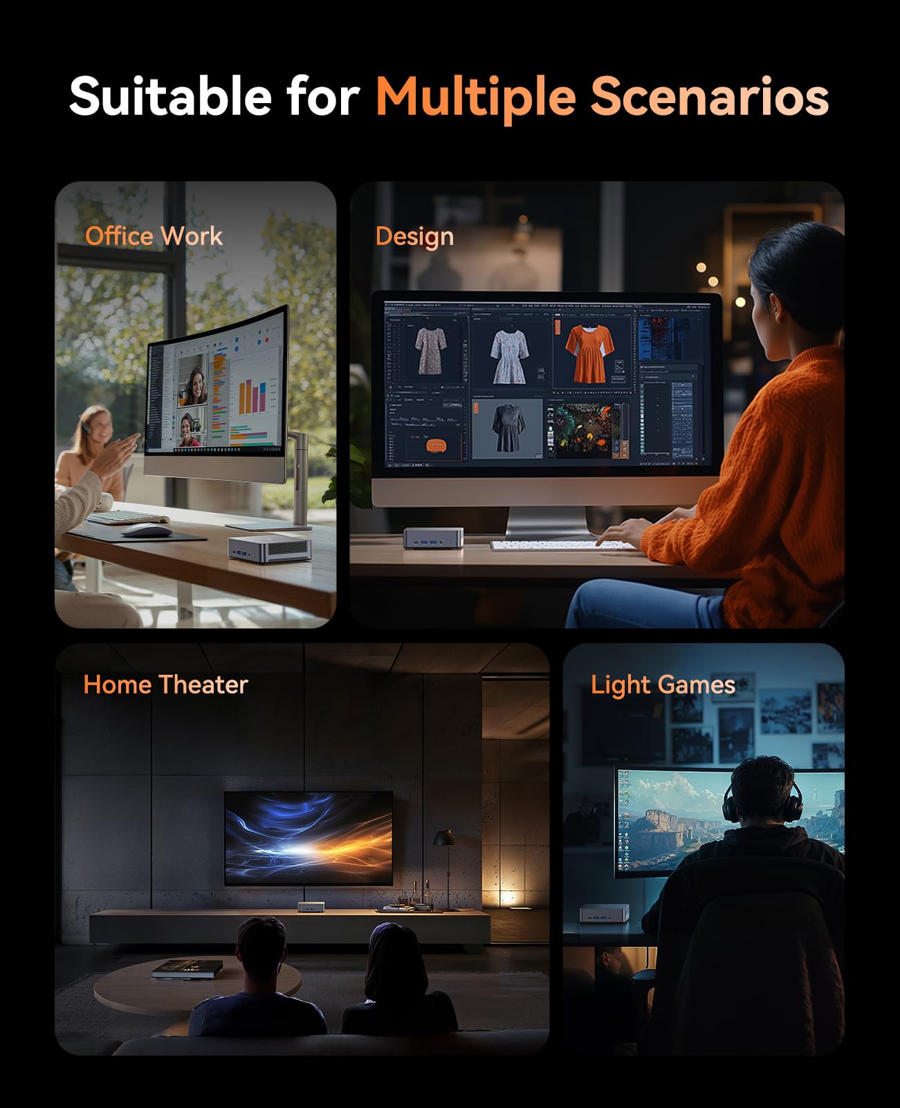 • 【4K@60Hz Quad-Screen-Display】Der Micro-PC ist mit der hochgelobten АMD Radeon 680M Grafikkarte 2400MHz, mit 2x HDMI 2.1, USB4 Type-C und USB3.2 Type-C Videoschnittstellen ausgestattet, genießen Sie 4K UHD Quad-Screen-Display, erhalten Sie einen größeren Arbeitsbereich und erreichen Sie ein effizientes Büro. Egal, ob Sie im Internet surfen, Adobe PR- und PS-Anwendungen ausführen oder Spiele spielen, der Mini-PC bietet eine hervorragende Bildqualität und bringt mehr Farbe und Freude in Ihr Leben.