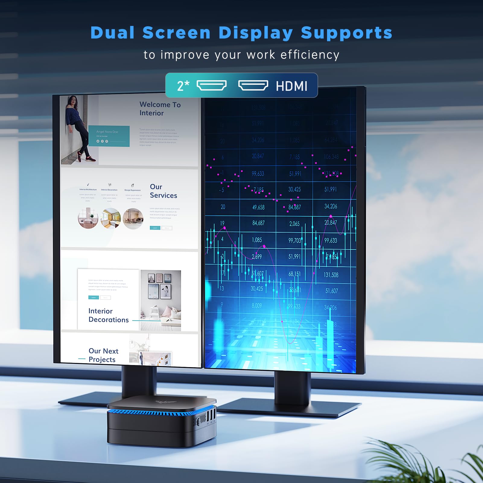 - 【2 Displays 4K@60Hz unterstützt】 Es gibt 2 HDMI Anschlüsse am Mini PC, Sie können 2 Displays gleichzeitig anschließen, 4K Auflösung wird unterstützt, es erfüllt die Anforderungen verschiedener Bürosoftware, Bildverarbeitung, Videobearbeitung, Formularproduktion. Als Multimedia Gerät bietet es Ihnen auch ein hervorragendes visuelles Erlebnis. Ausgestattet mit einer VESA Halterung können Sie es überall installieren.