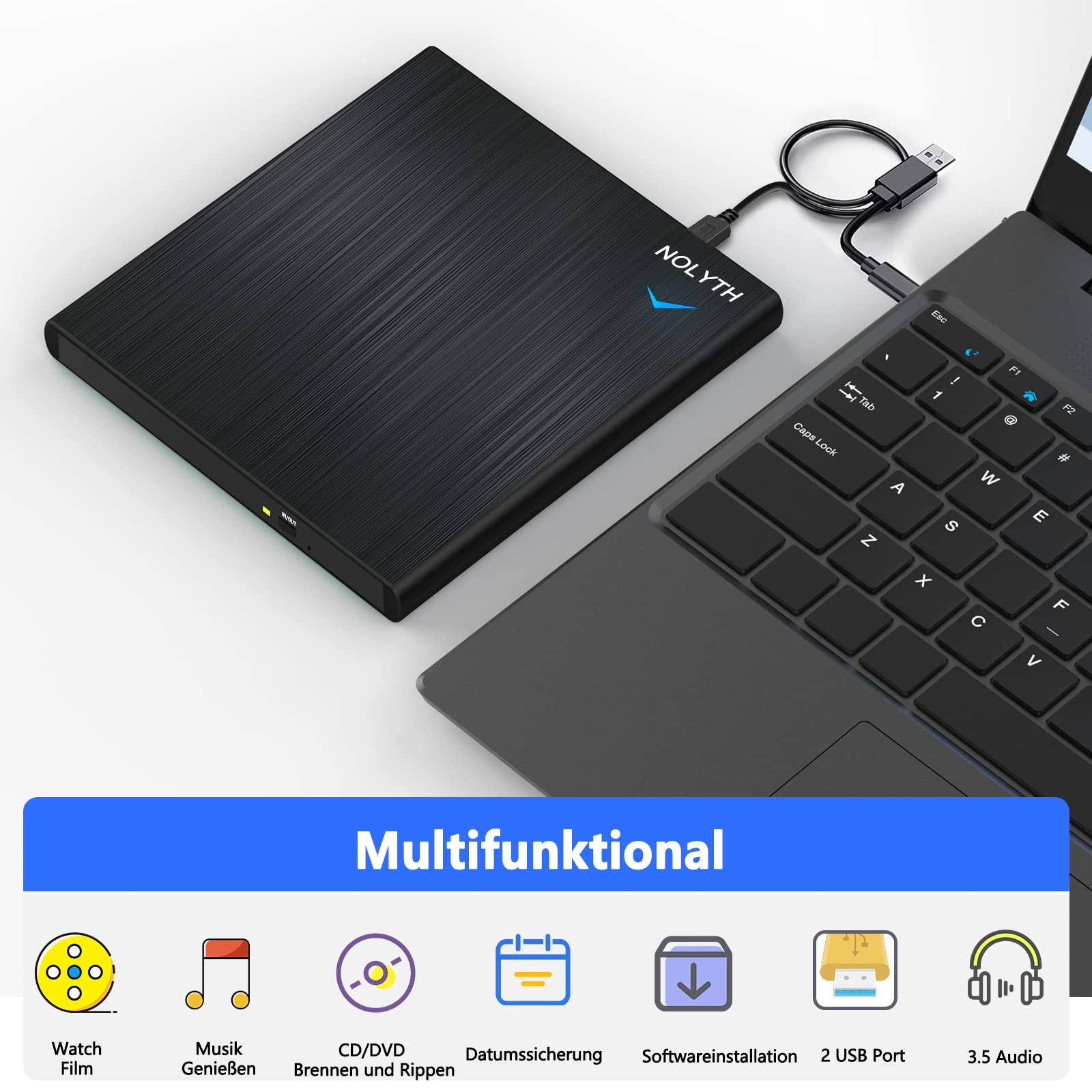 - Externes DVD Laufwerk mit Audioausgang: NOLYTH dieses DVD laufwerk extern hat das neueste design mit 3,5mm audio ausgang und 2 USB steckplätze. Sie können einfach die kopfhörer/ohrhörer/headset/USB geräte in die audiobuchse und USB anschlüsse einstecken, um den hochwertigen 3,5mm audio stereoklang zu genießen und das problem der unzureichenden USB anschlüsse an Ihrem laptop zu lösen